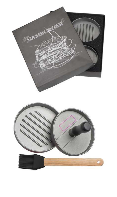 Alumiininen hampurilaispihvipuristin silikoniharjalla, pakattu yksittäiseen laatikkoon. Kiinnitämme logosi laatikkoon etiketin kanssa.