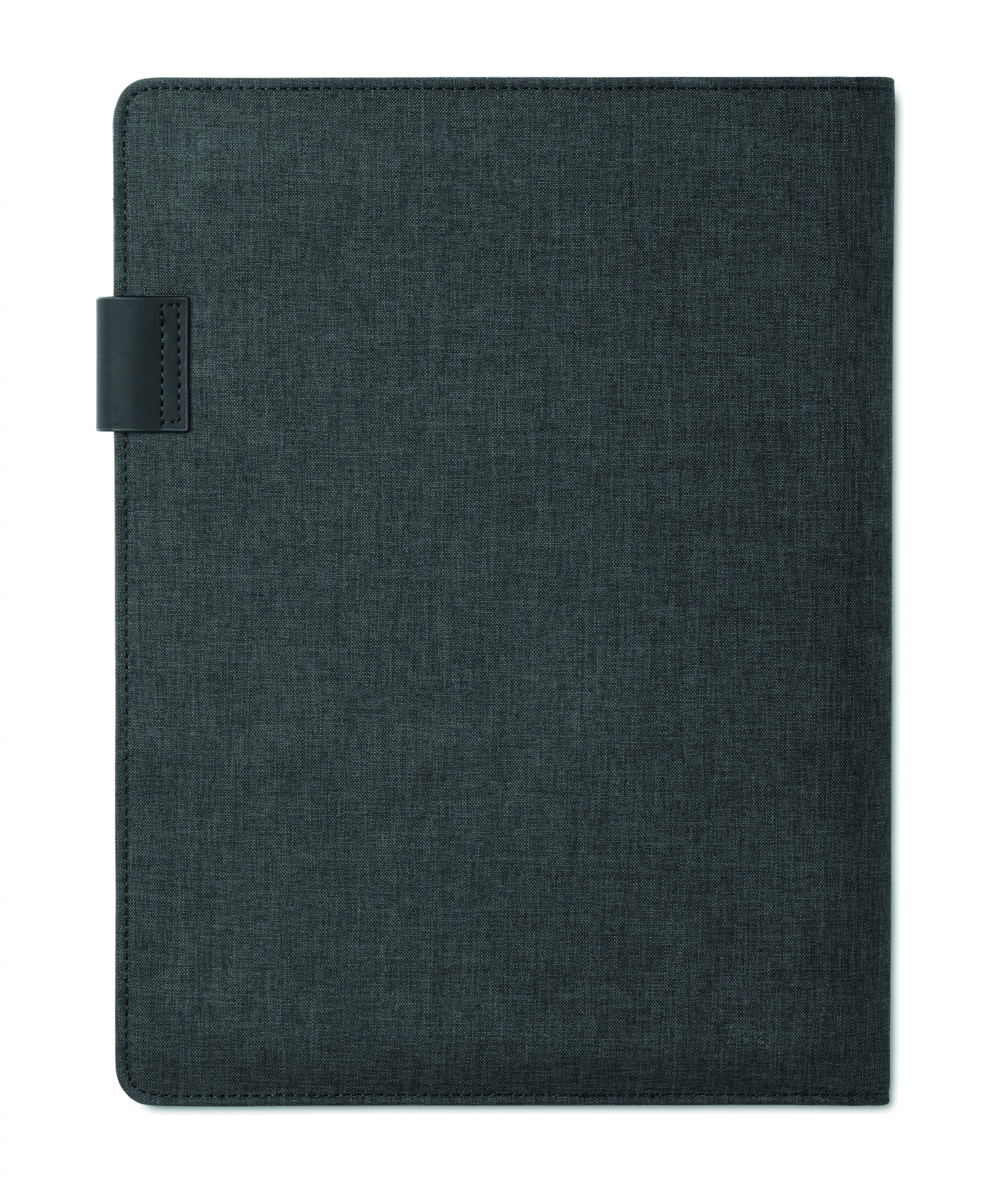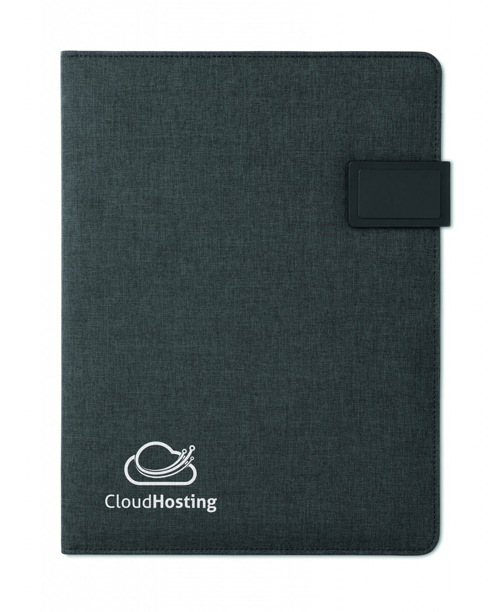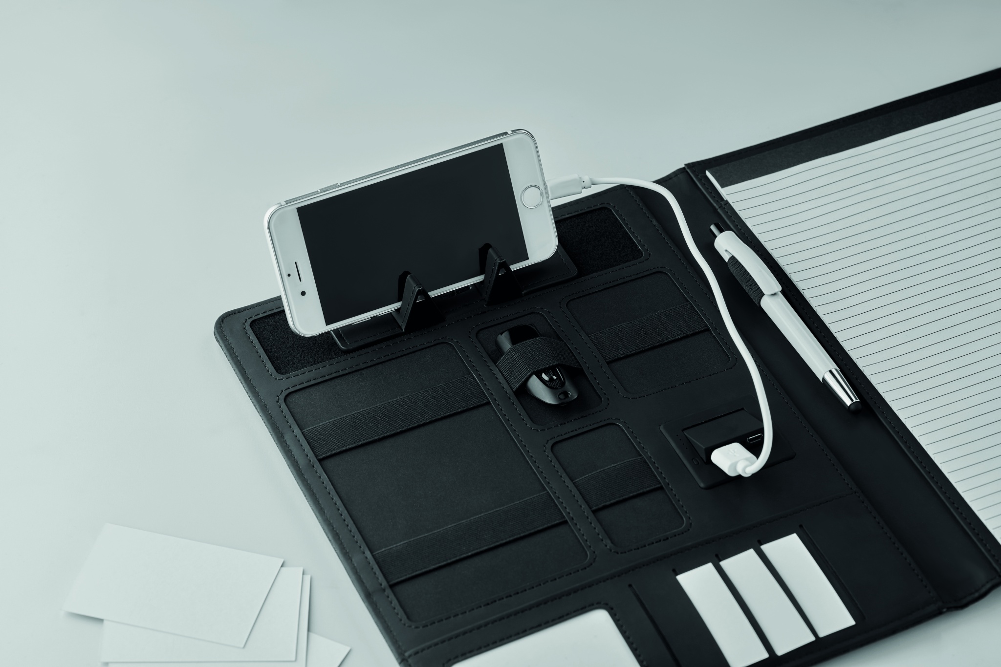 Pellava/PU A4 kokouskansio, jossa magneettisuljin. Sisäänrakennettu varavirtalähde 4000 mAh:n kapasiteetilla, joka riittää älypuhelimen lataamiseen 1-2 kertaa mallista riippuen. Sisäänrakennettu mikro-USB C- tyypin liitin. Sisältää matkapuhelintelineen, 20-sivuisen lehtiön ja useita pieniä taskuja helppoa säilytystä varten.