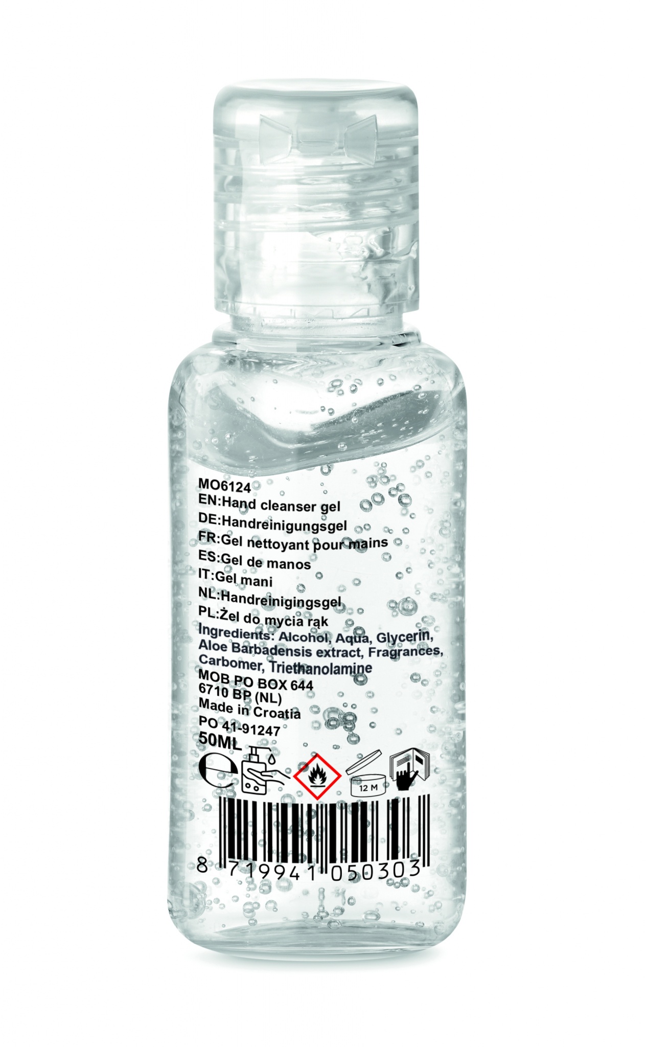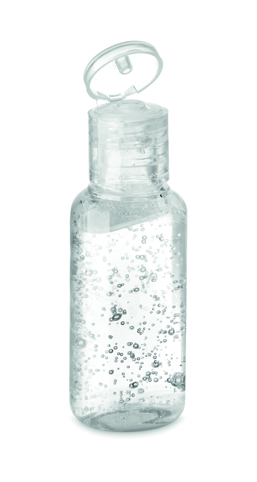 50 ml käsigeeli PET pullossa, 70% alkoholillinen neste. Tuote on kosmeettinen tuote, eurooppa tuotantoa.