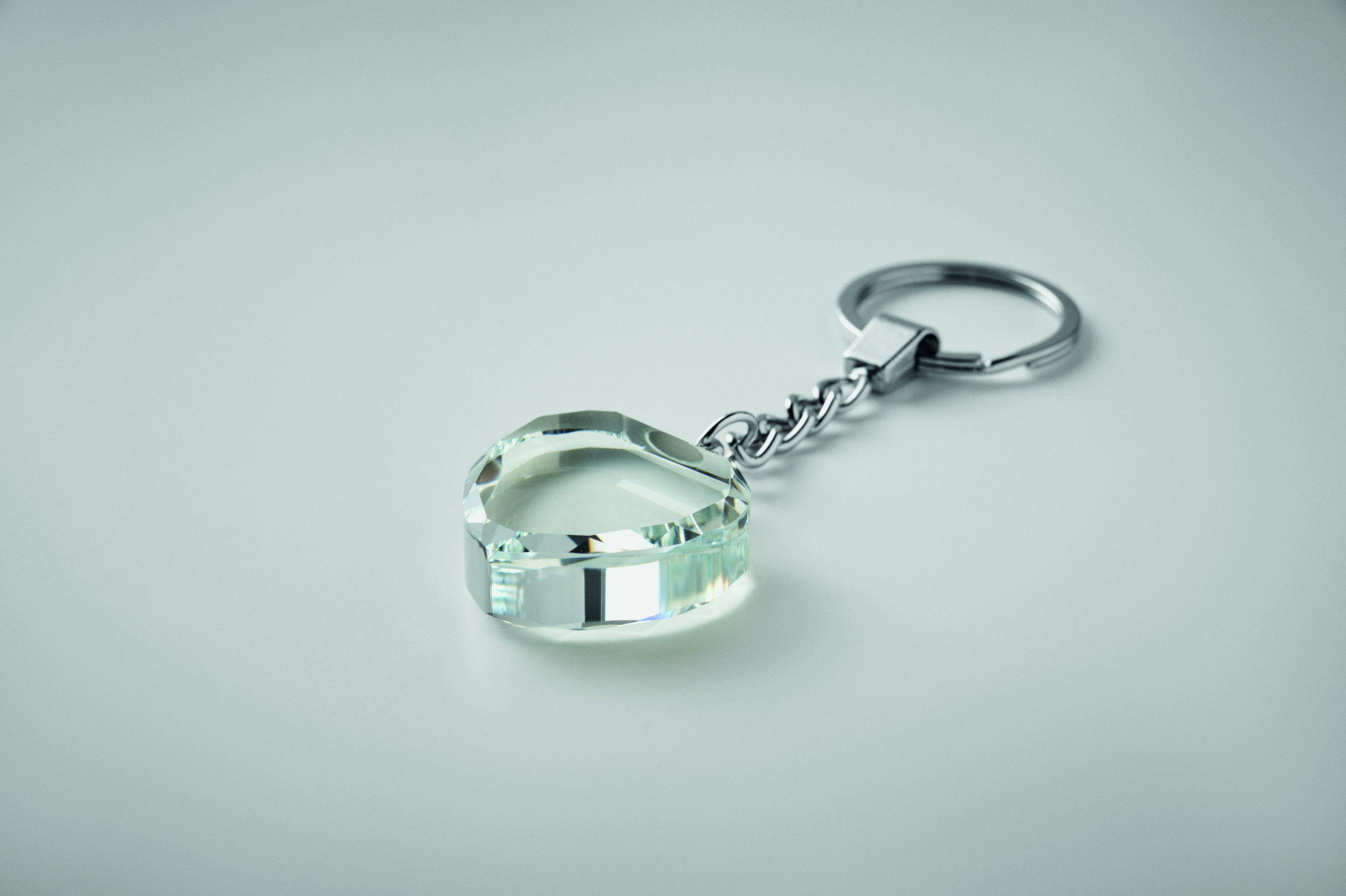 Lasinen sydänaiheinen avaimenperä lahjapakkauksessa.