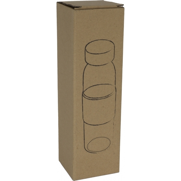 Lasipullo, jonka tilavuus on 500 ml, korkkiholkki erityisen miellyttävää käsituntumaa varten ja bambukansi. Laserimme logosi korkkipinnoitteeseen.
