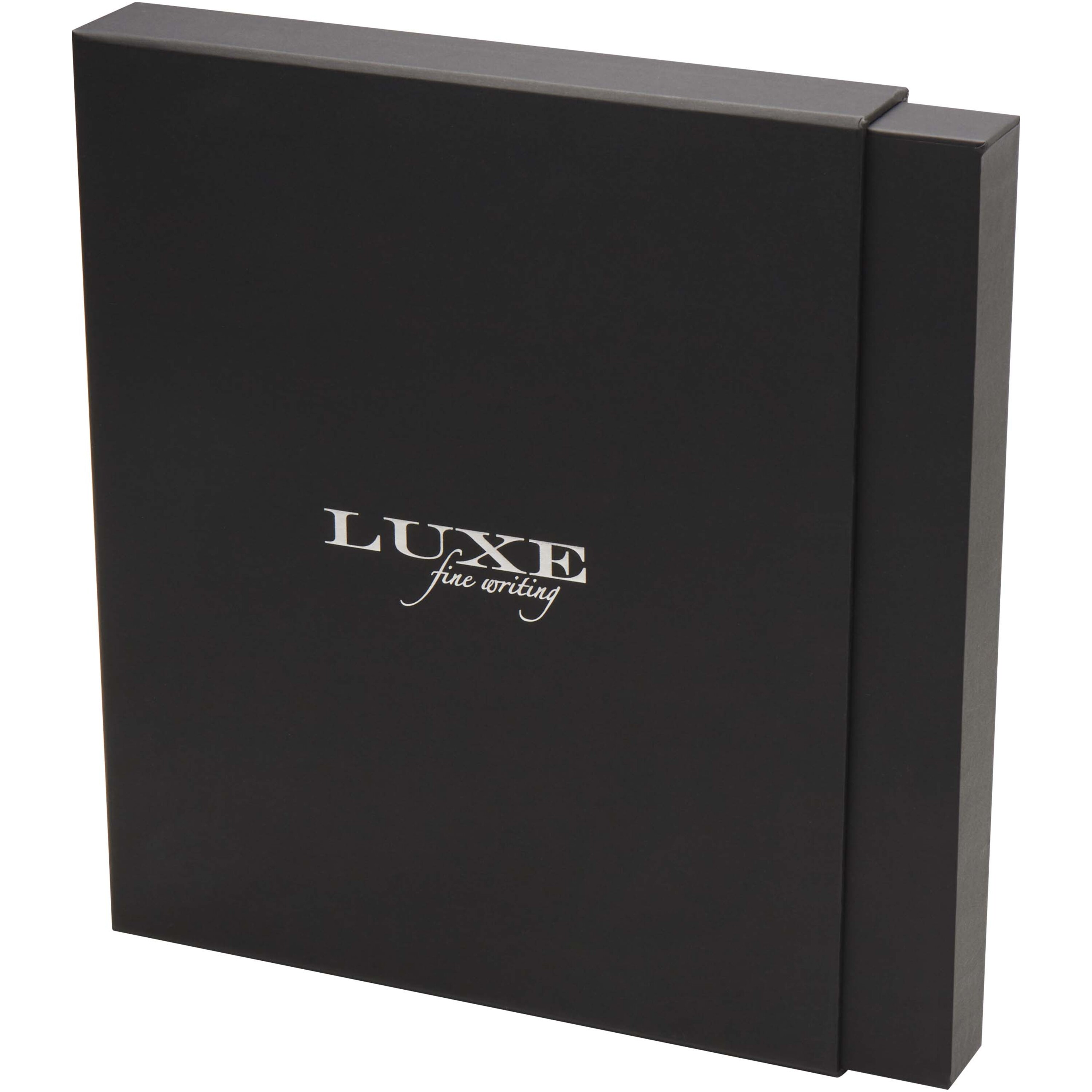 Legato on tyylikäs A5-kokoisen muistivihkon ja kuulamustekynän yhdistelmäetti. Kynässä on kierrätetystä messingistä valmistettu rungon yläosa kultakromatulla pinnoitteella, rungon alaosa mustalla/ruskealla ruiskumaalauksella, metalliset kultakromatut yksityiskohdat sekä LUXE-logo keskiosan renkaassa. Musteen väri: Musta. Kirjoituspituus: 400 metriä. Kärjen koko: 0,7 mm. Muistivihkossa on 80 viivoitettua arkkia 80 g/m²:n paperia, kierrätetystä muovista valmistettu kansi, kuminauhasuljin, nauhamerkki ja haitaritasku. Kultakromattu metallinen yksityiskohta kuminauhasuljinosassa. Toimitetaan kierrätetystä kartongista valmistetussa lahjapakkauksessa.