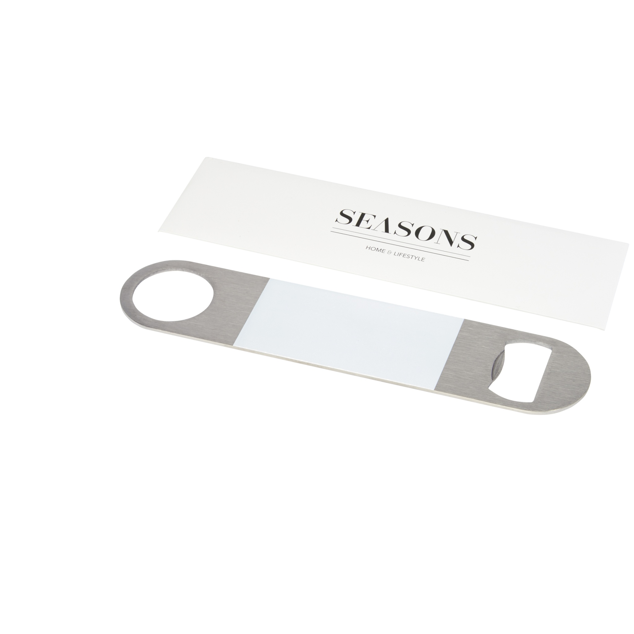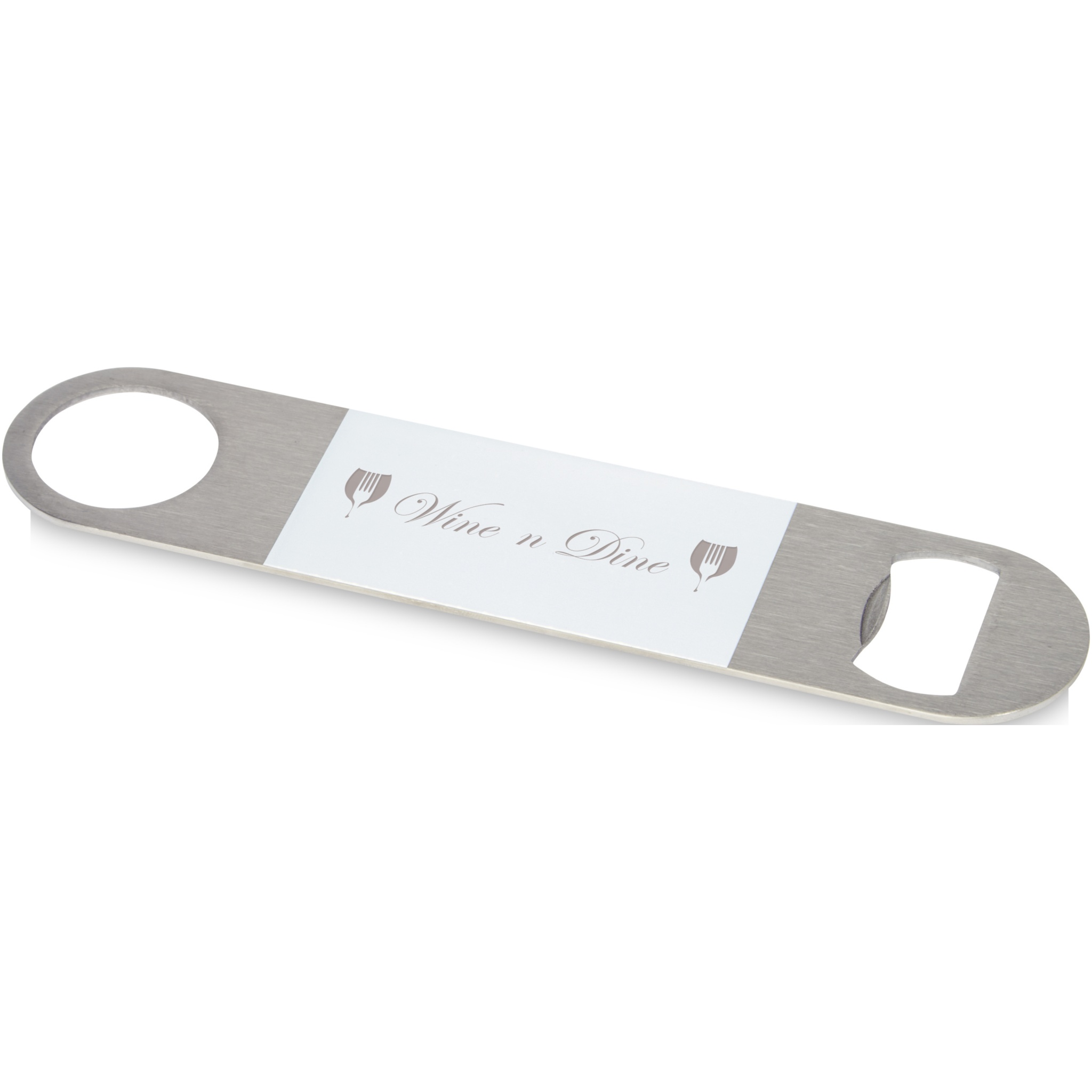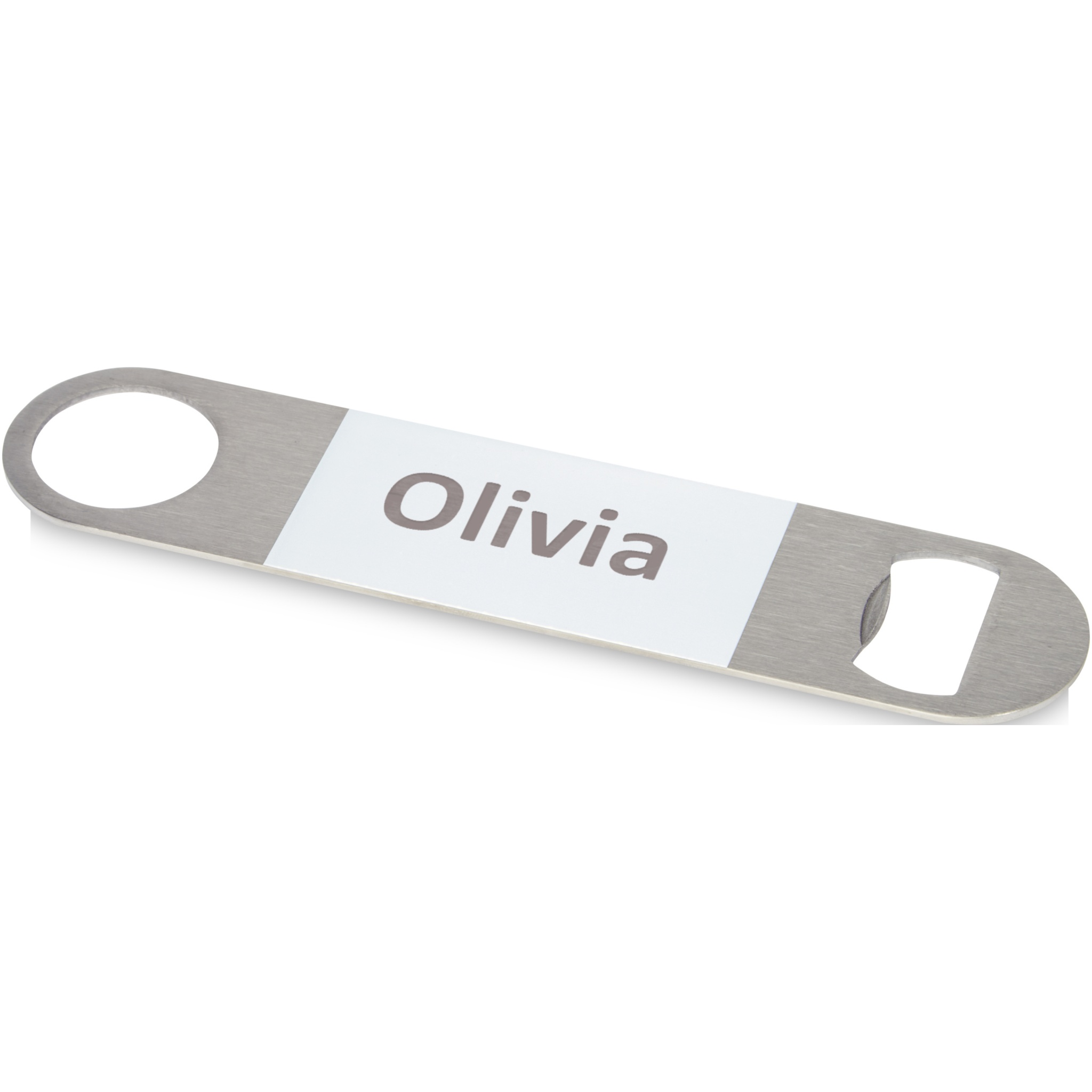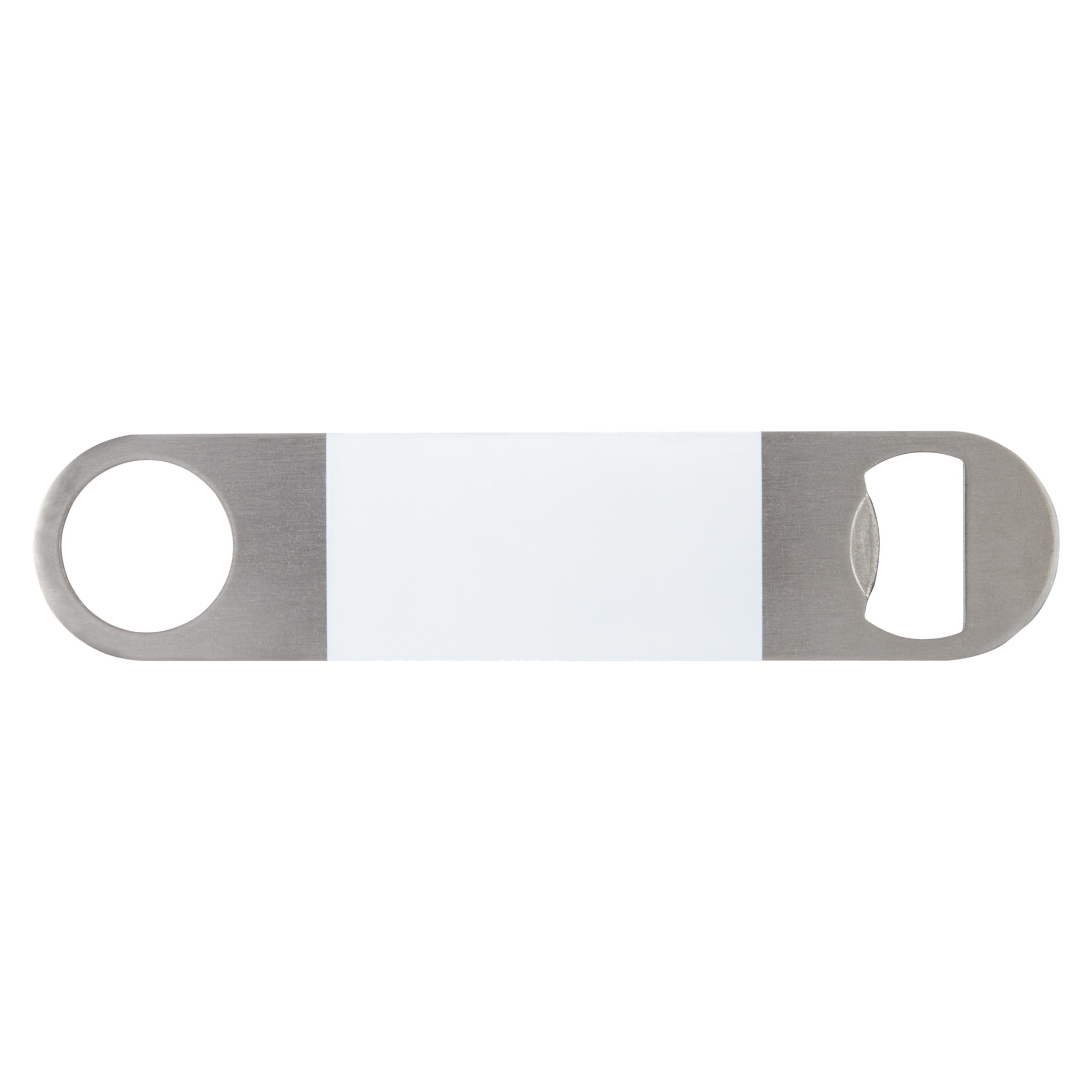 Ruostumattomasta teräksestä valmistettu pullonavaaja, jonka keskellä on suuri värillinen alue.