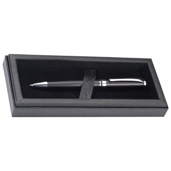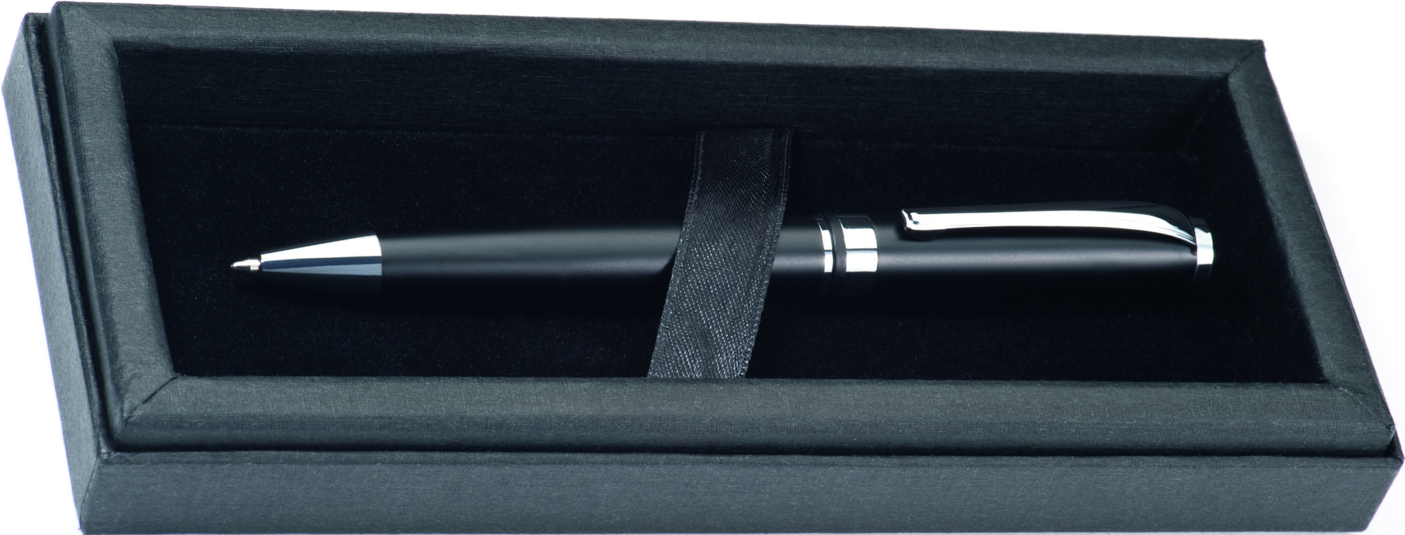 Laadukas metallikynä mattamustalla, kiiltävällä hopealla ja tyylikkäällä kotelolla. Kaivertamme logosi klipsien alle.