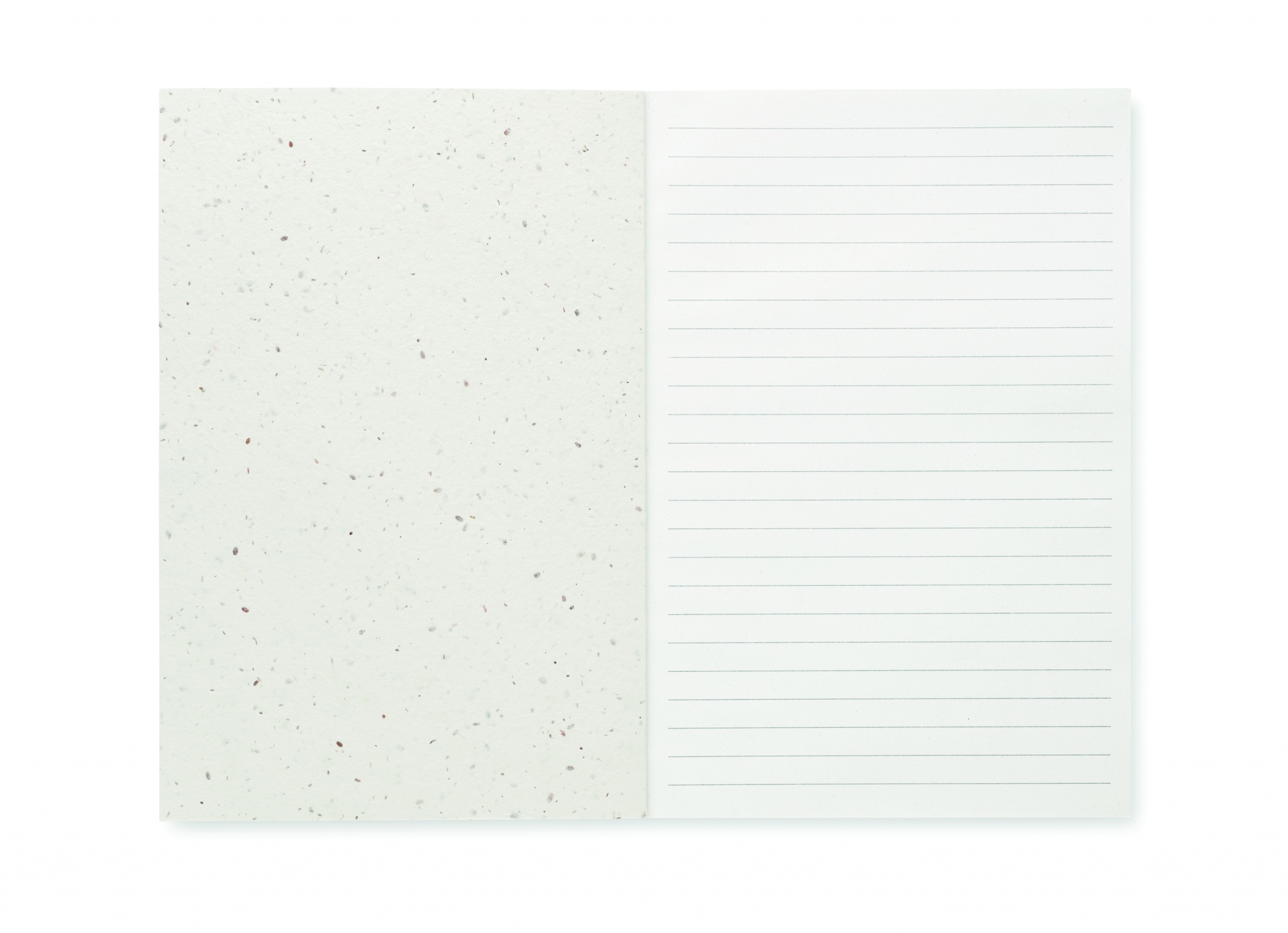 A5-muistikirja jossa pehmeä siemenpaperista tehty kansi. Nidottu. 200 kierrätettyä viivoitettua sivua (100 arkkia).