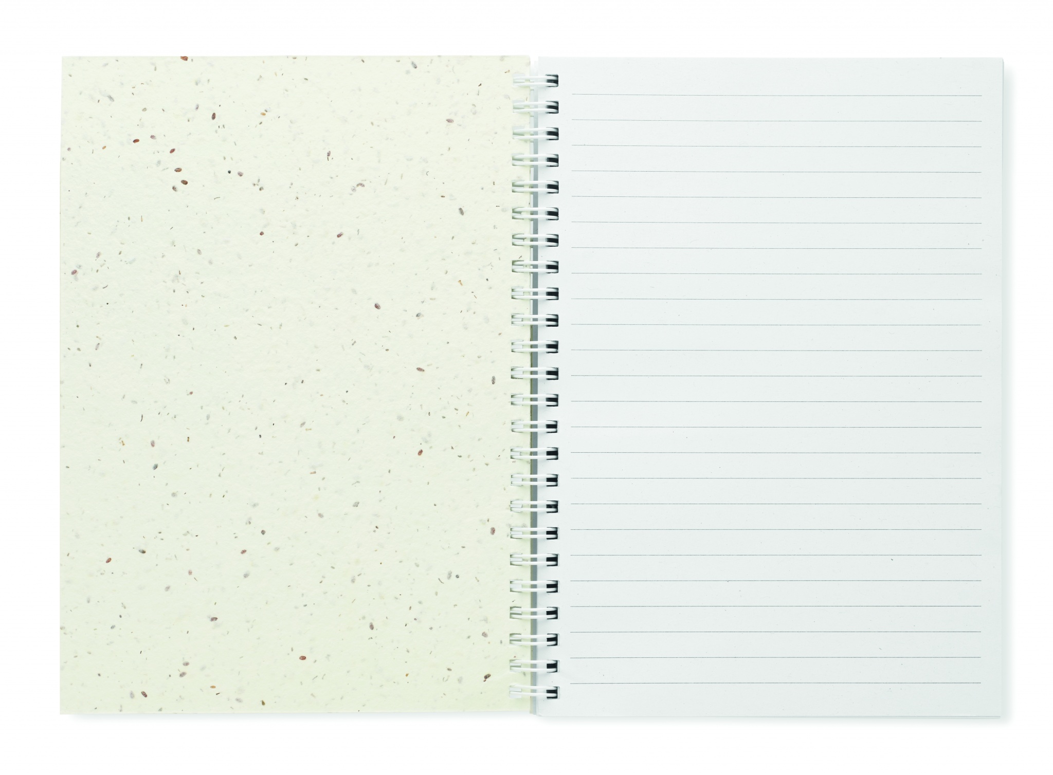 A5-muistikirja, jonka kansi on siemenpaperia. Kierresidottu. 200 kierrätettyä viivoitettua sivua (100 arkkia).