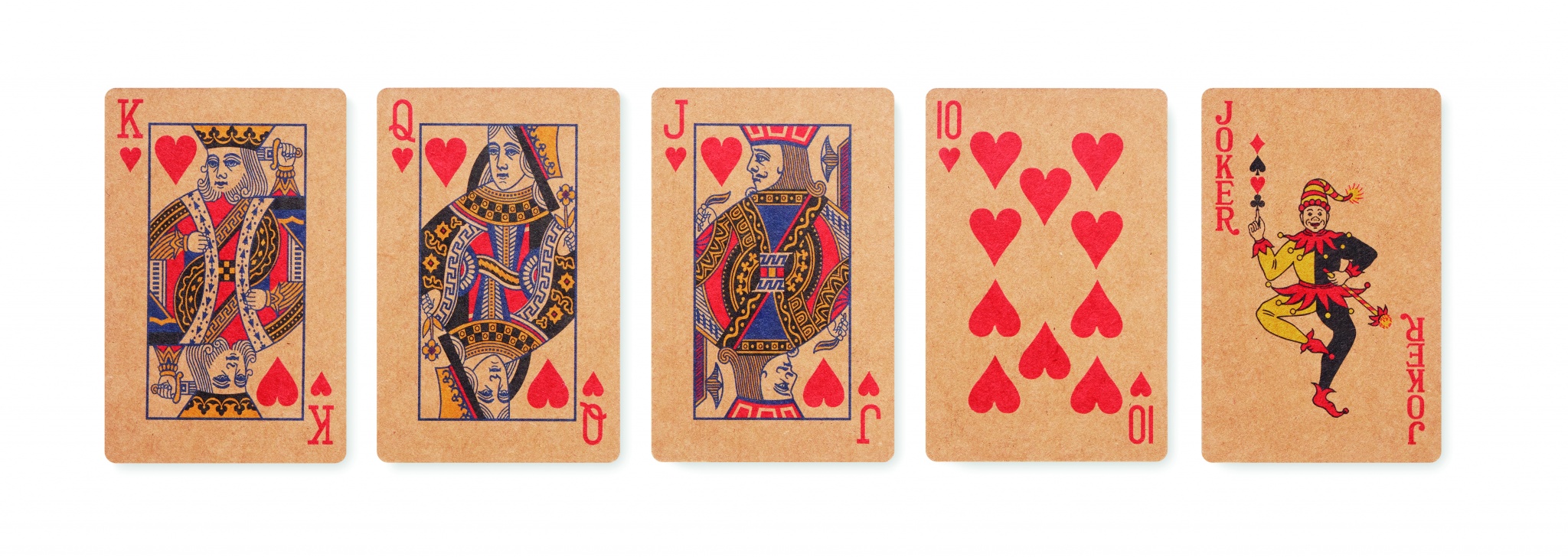 Kierrätetyt pelikortit paperisessa laatikossa, 54 pelikorttia.