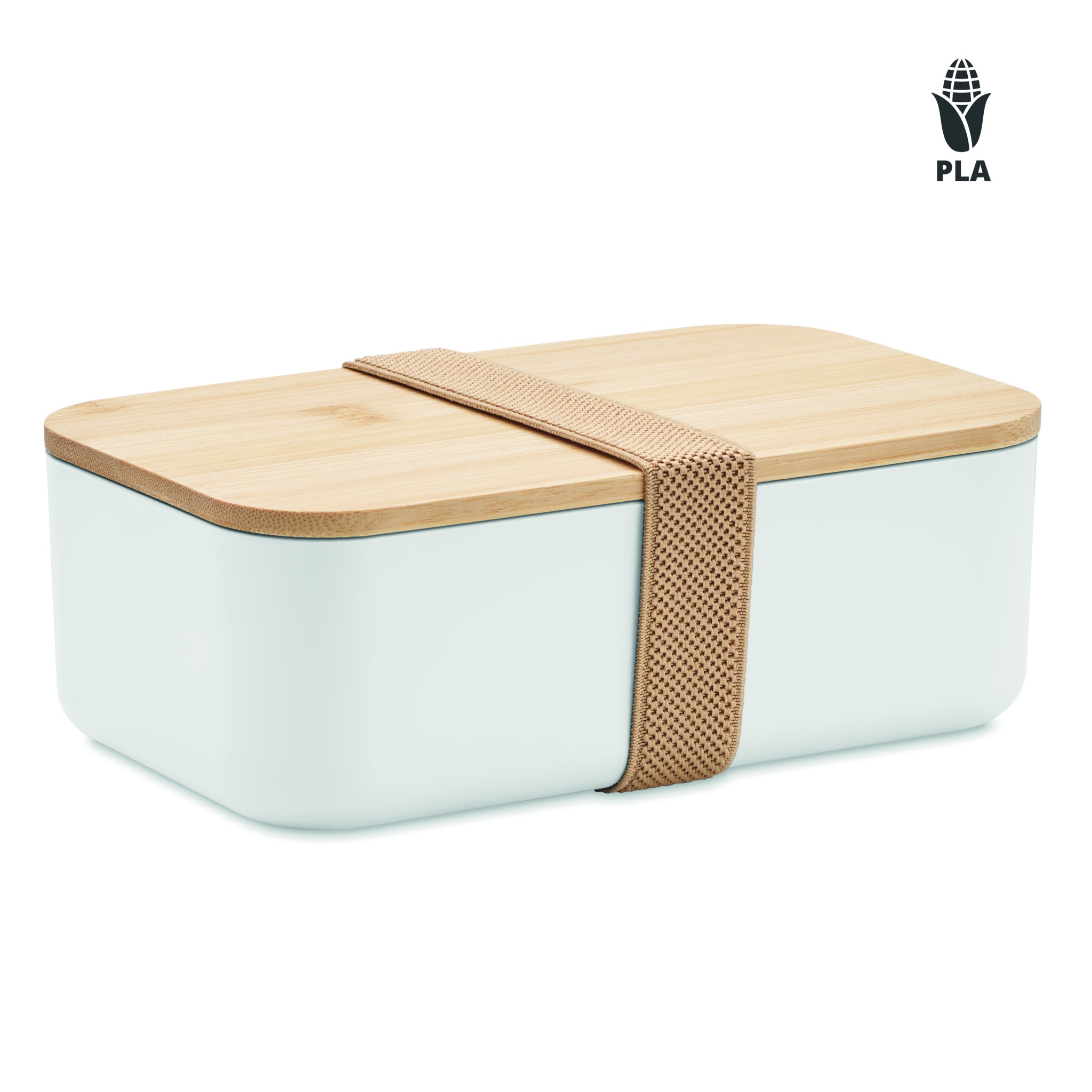 100 % PLA-maissi lounasrasia, jossa bambukansi ja RPET-kuminauhakiinnitys. Tilavuus: 1000 ml.