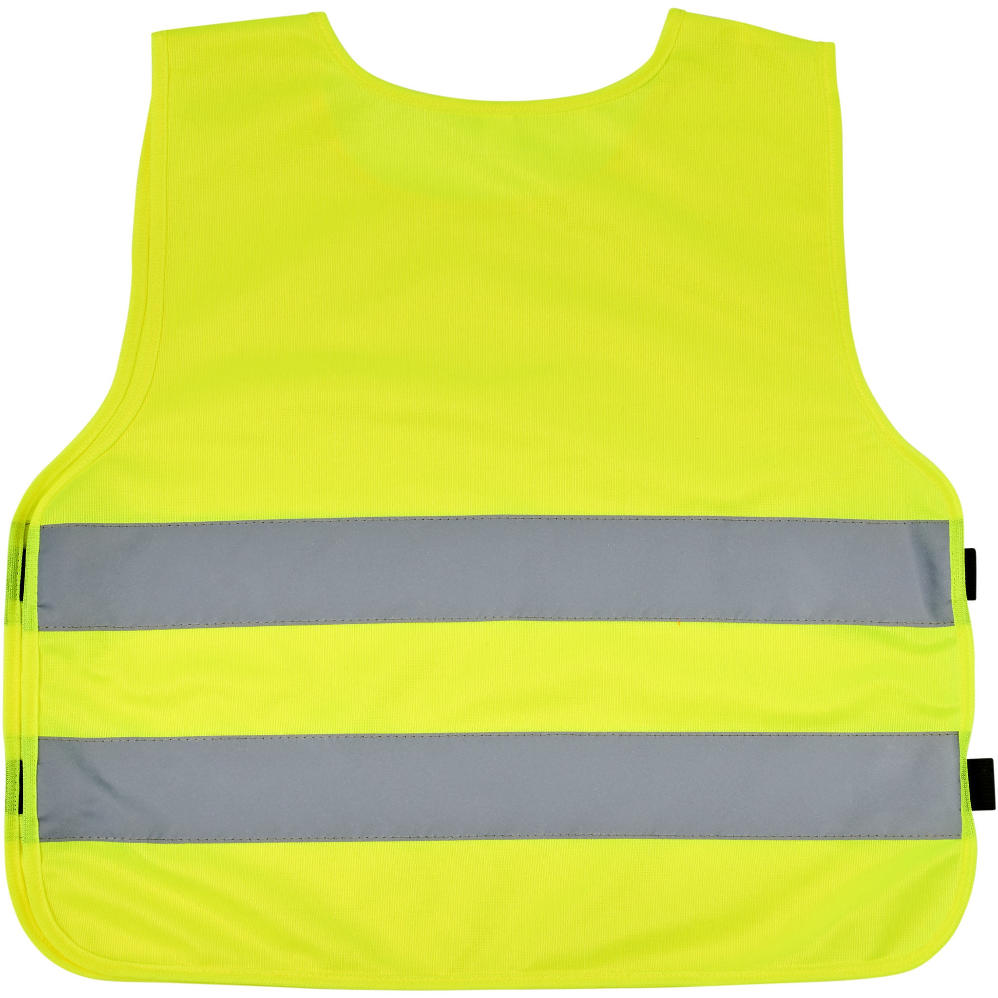 XS-kokoinen korkean näkyvyyden turvaliivi sopii 7–12-vuotiaille, joiden pituus on 104–121 cm. Suuri painatusalue liivin etu- ja takapuolella. Hartialinjan ja alareunan kuminauhoissa on tarranauhakiinnitys, joka lisää turvallisuutta ja helpottaa liivin pukemista. Liivi venyy toisen puolen kuminauhan ansiosta, joten sitä voi pitää paksunkin takin päällä. Liivi on testattu ja sertifioitu EN 1150:1999 -asetuksen mukaisesti. Se noudattaa myös henkilösuojaimiin liittyviä ohjeita, jotka koskevat (EU) 2016/425 -asetuksen soveltamista luokan II henkilökohtaisiin suojaimiin.