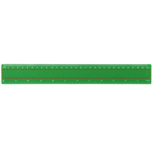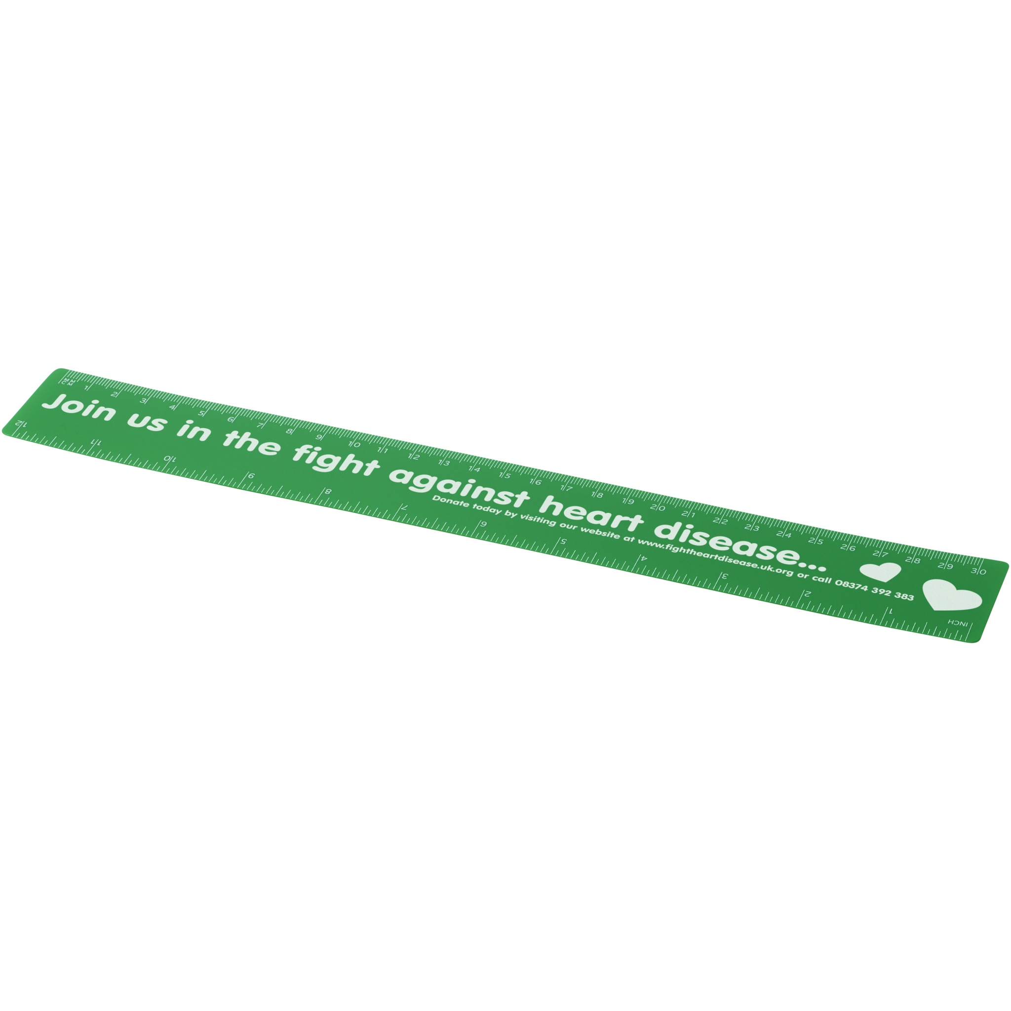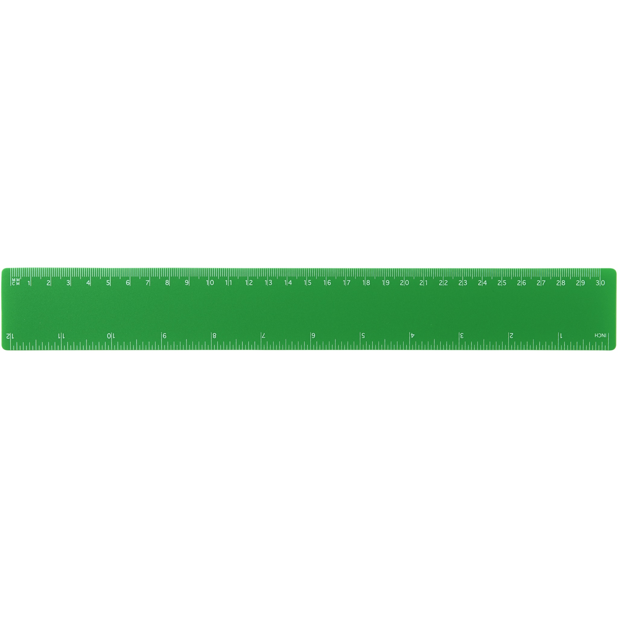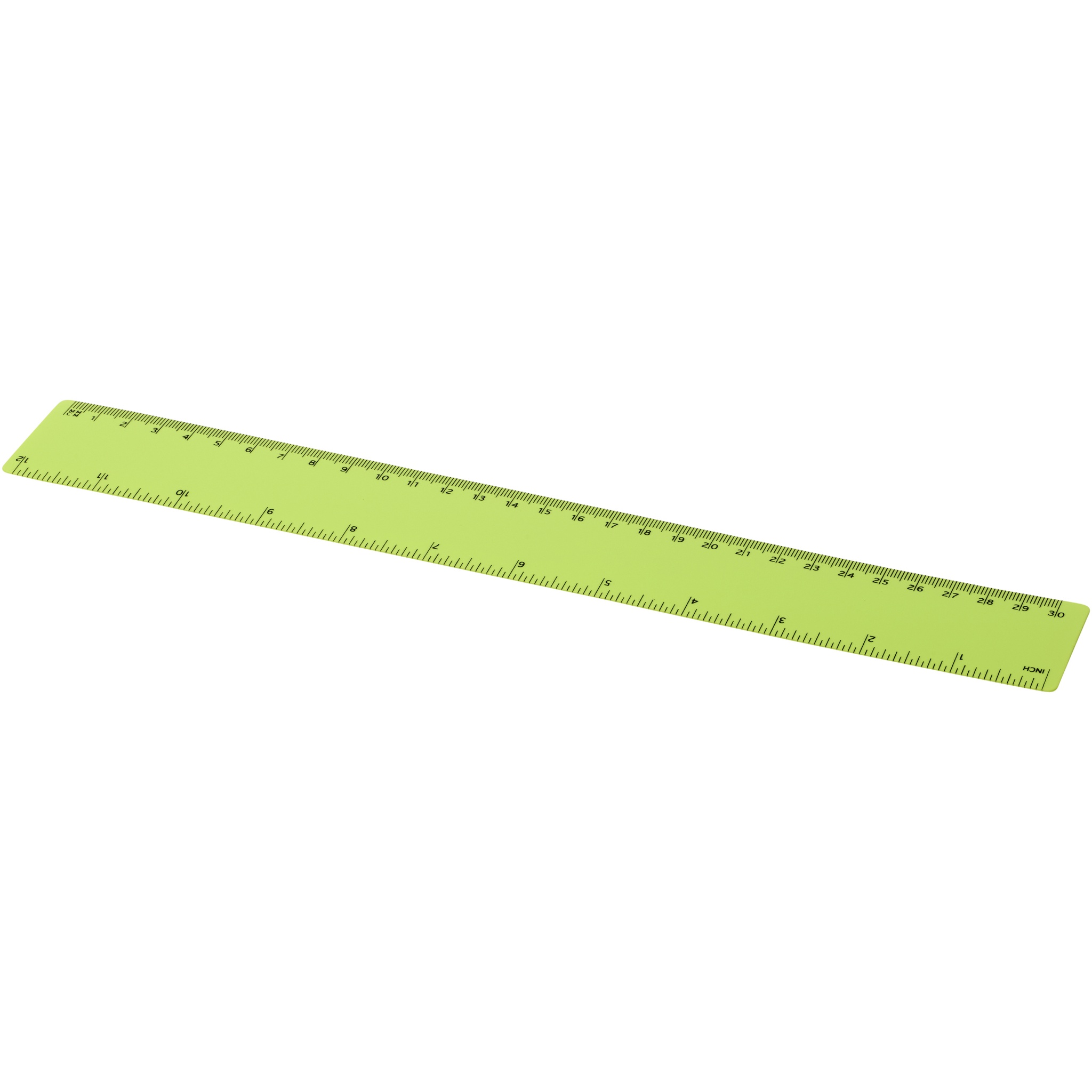 Joustava kevyt muovinen viivain, johon on merkitty tuumat ja senttimetrit.
