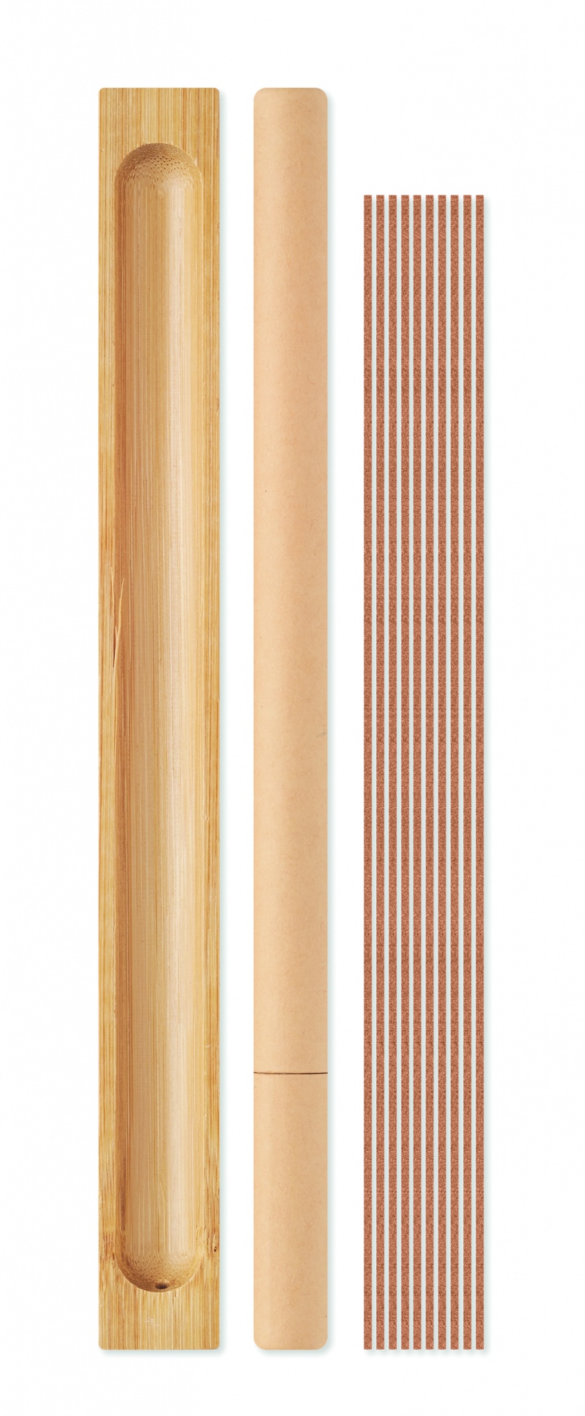 Tuoksusarja, sisältää 10 santelipuun tuoksuista suitsuketikkua ja bambutelineen. Pakattuna bambuiseen rasiaan.