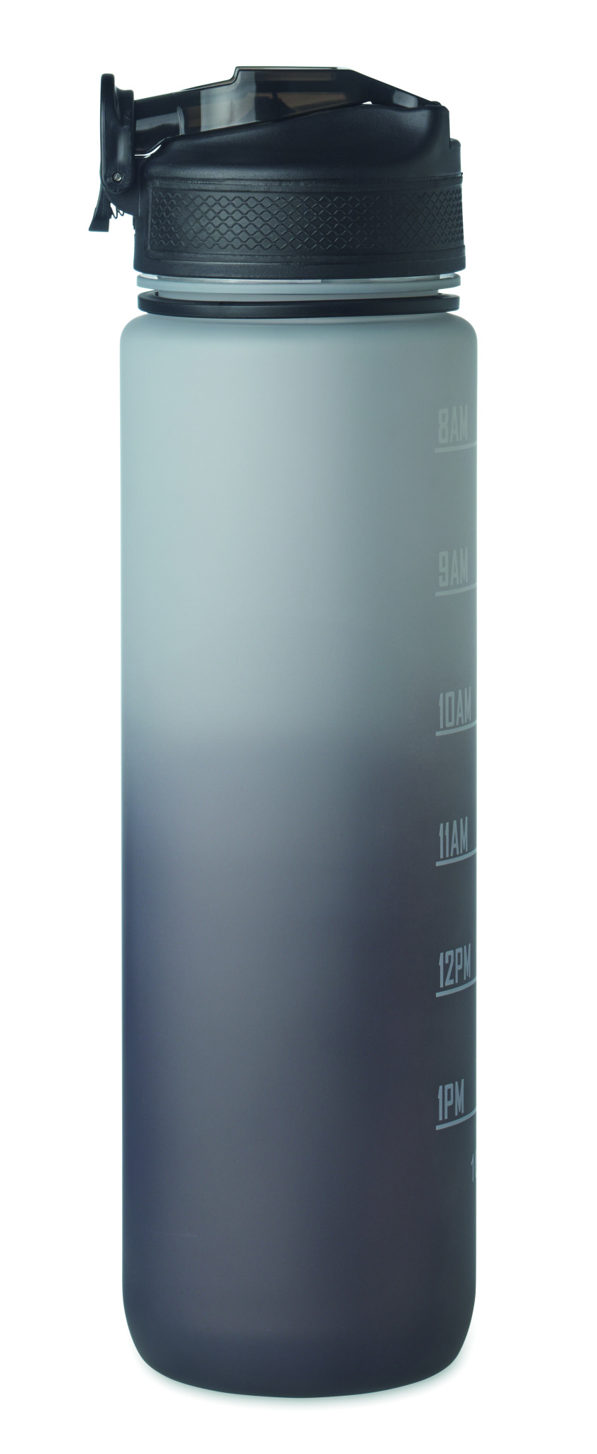 RPET-muovista valmistettu urheiluvesipullo, jossa on integroitu olki, pehmeä silikoninen suukappale, motivoiva aikamerkintä, yhdellä kädellä avattava kääntyvä kansi, turvalukko ja kantohihna. Vuotamaton. Tilavuus 1L.