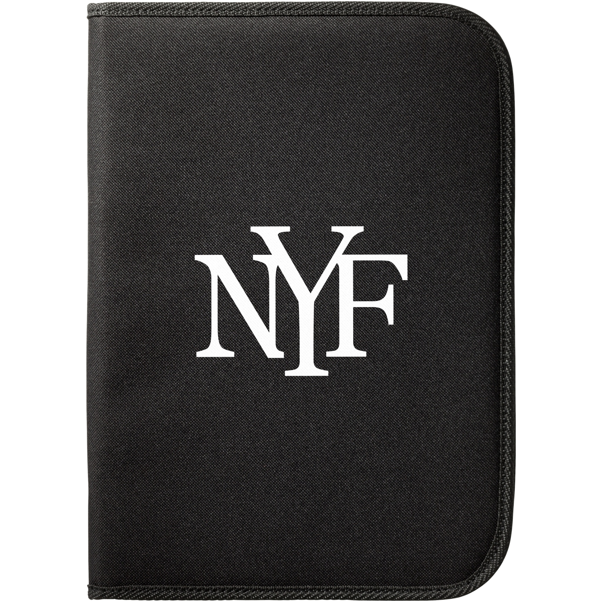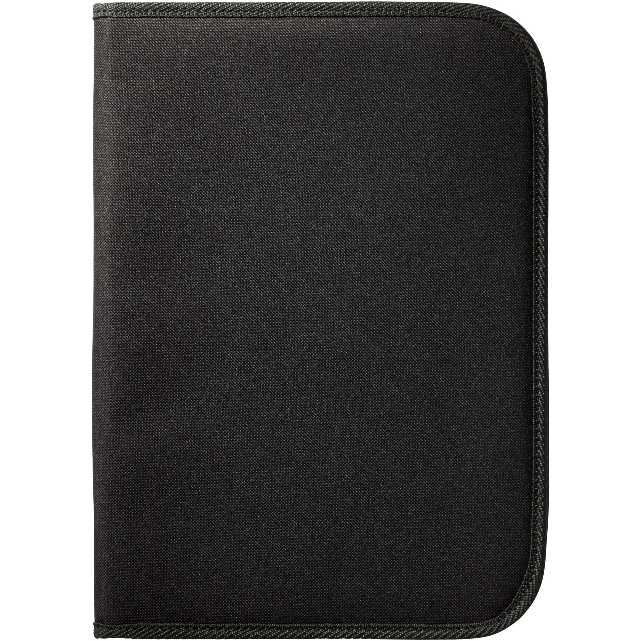 Kansiossa on vetoketju, kynälenkki, asiakirjataskut ja 20 viivoitettua muistipaperia. Kynä ja tarvikkeet rekvisiittaa.