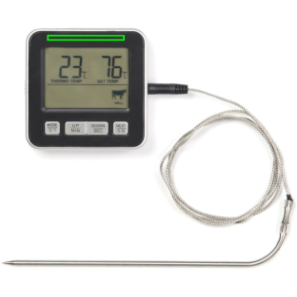 Valmista täydellinen ateria tämän kätevän ruoanlaittolämpömittarin avulla. Olitpa sitten paistamassa mehevää paahtopaistia tai erityistä kakkua, tämä monipuolinen lämpömittari on korvaamaton apu keittiössä riippumatta siitä, onko kyseessä paistaminen uunissa, grillaus vai leivonta. Ajastintoiminto ja hälytystoiminto auttavat säilyttämään hallinnan. Lisäksi lämpömittari näyttää sekä celcius- että fahrenheit-asteet, joista voit valita itsellesi mieluisemman. Yksikään keittiö ei ole täydellinen ilman tätä.