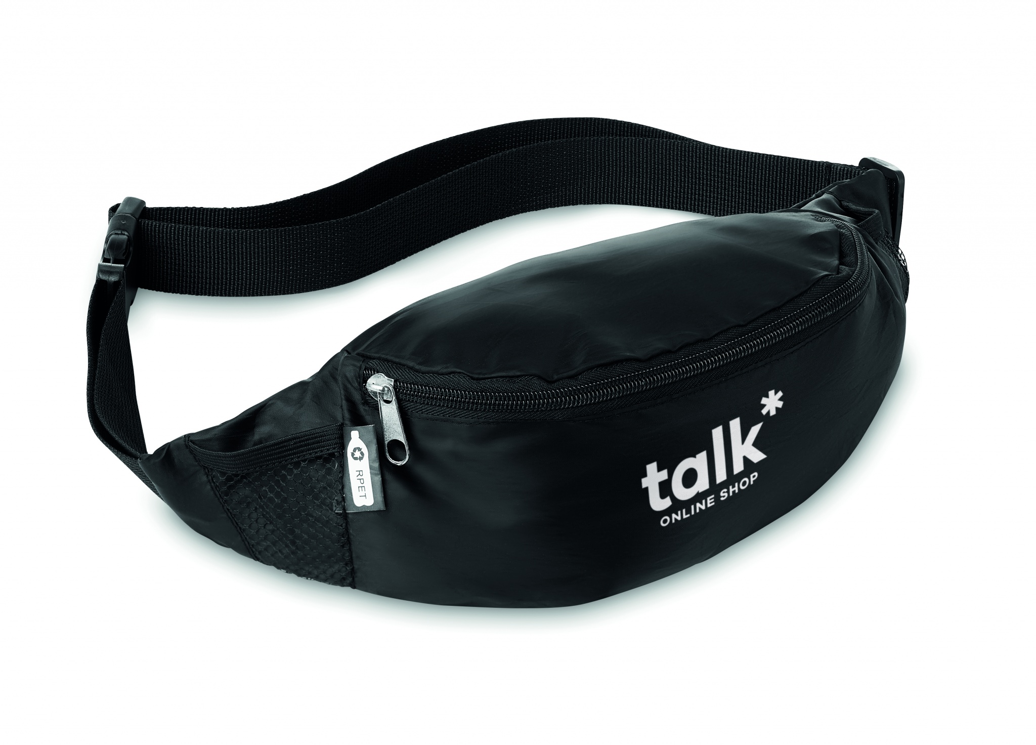 Fanny krepšys iš 210D RPET su užtrauktuku pagrindiniu skyriumi ir reguliuojamu juosmens dirželiu.