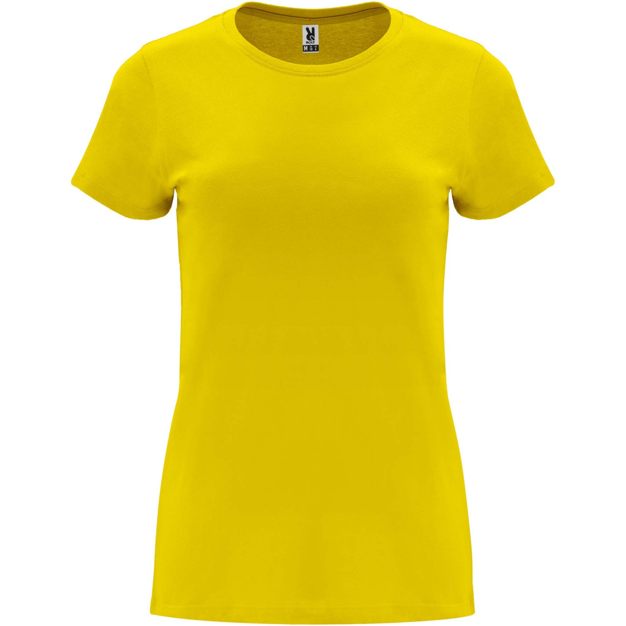 Moteriški marškinėliai trumpomis rankovėmis. 1x1 briaunotas kaklelis. Sustiprintos dengtos siūlės apykaklėje. Nuimama etiketė.
