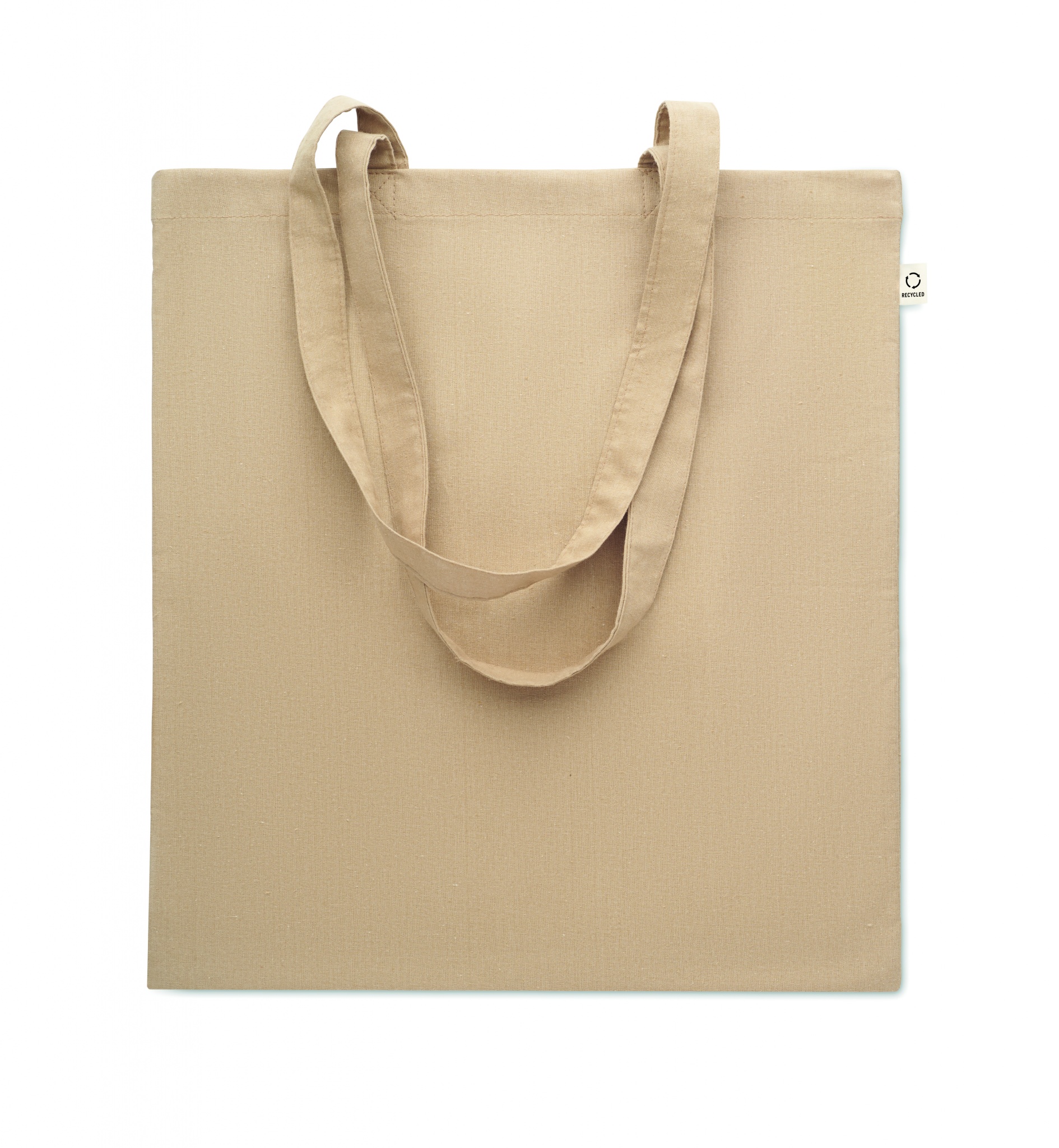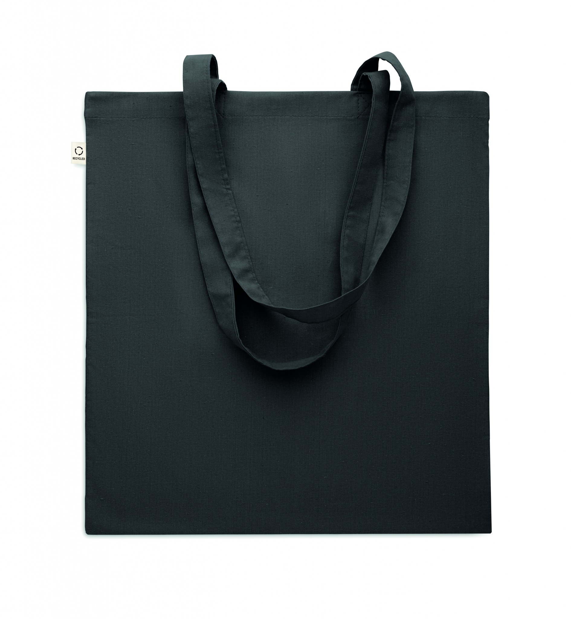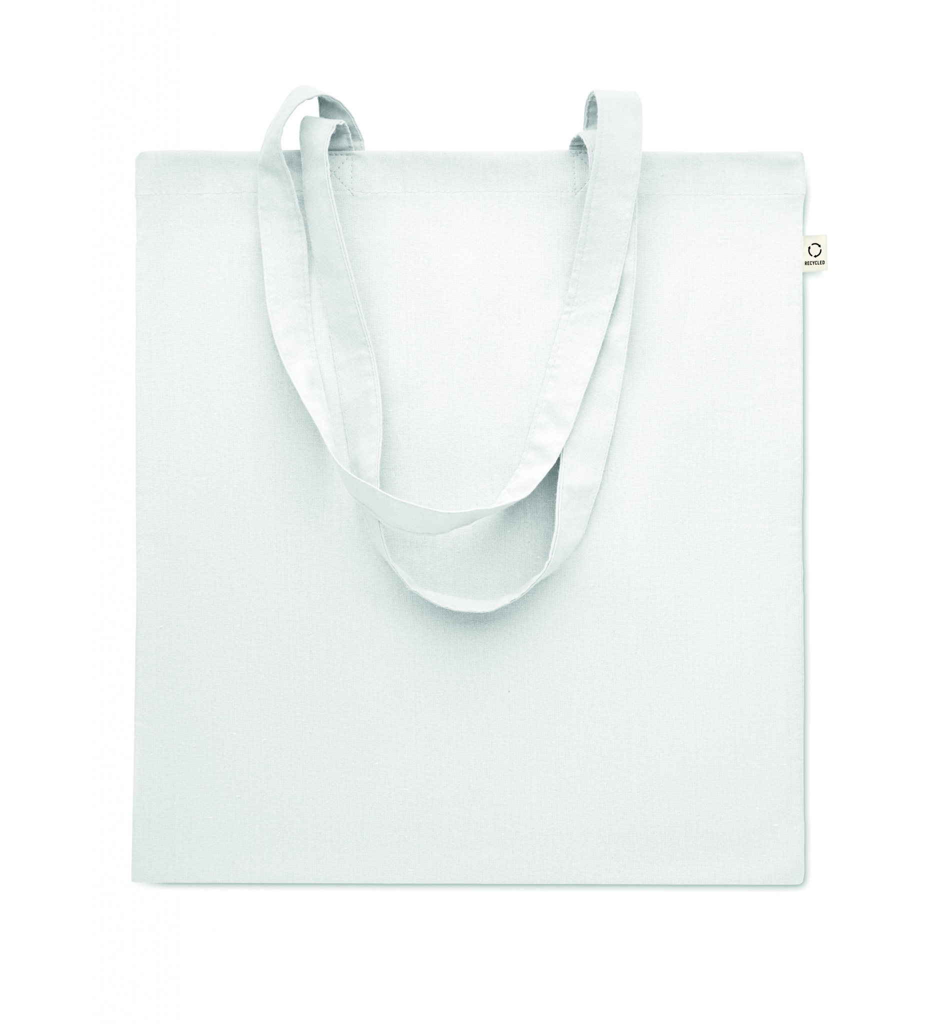 Perdirbtos medvilnės pirkinių krepšys (70 % perdirbtos medvilnės ir 30 % RPET) ilgomis rankenomis. 140 gr/m².