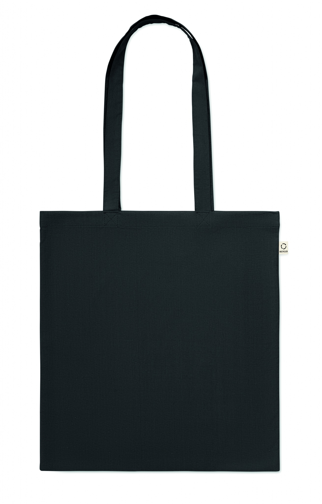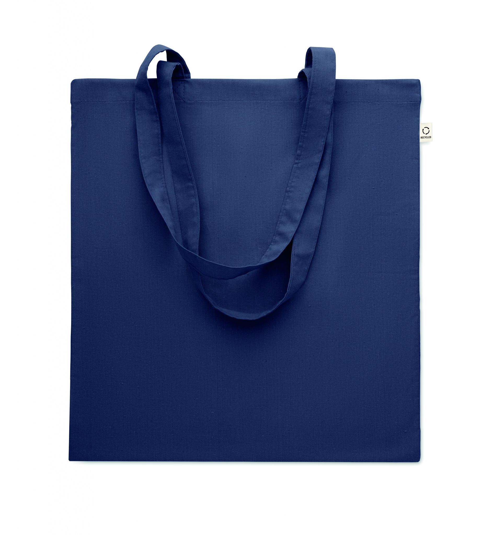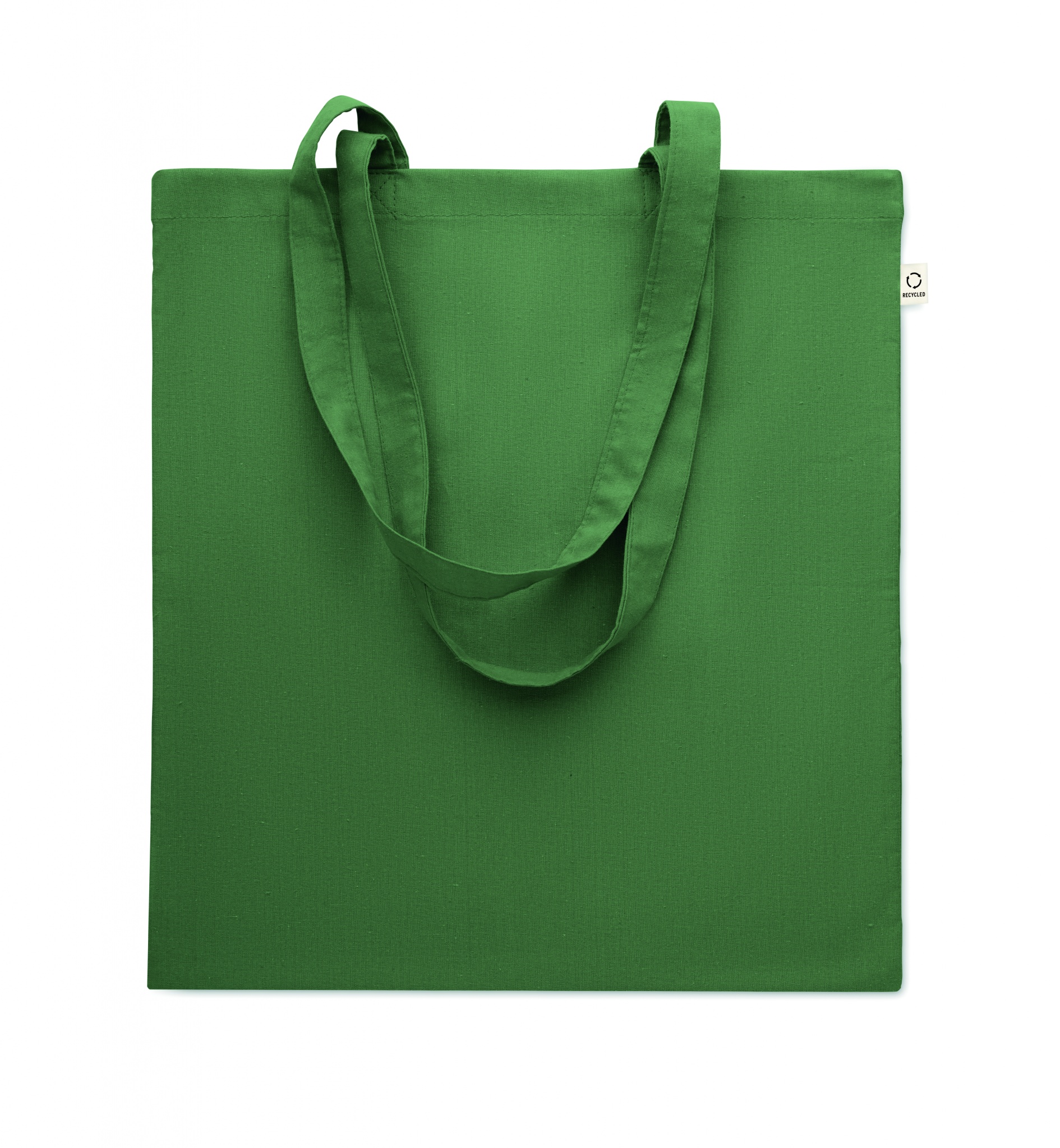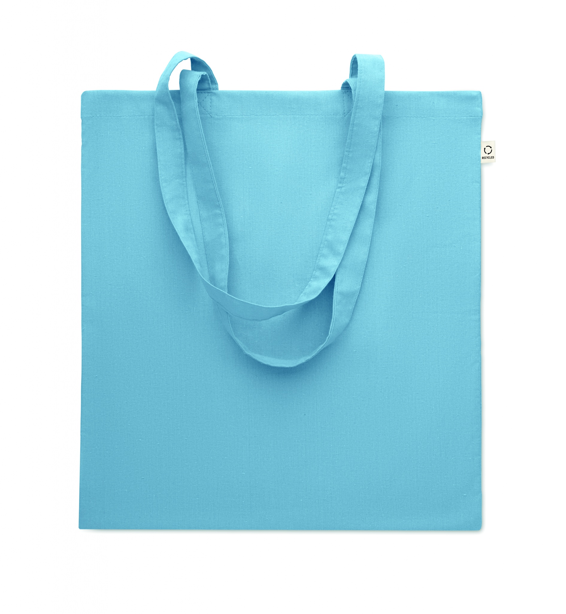 Perdirbtos medvilnės pirkinių krepšys (70 % perdirbtos medvilnės ir 30 % RPET) ilgomis rankenomis. 140 gr/m².