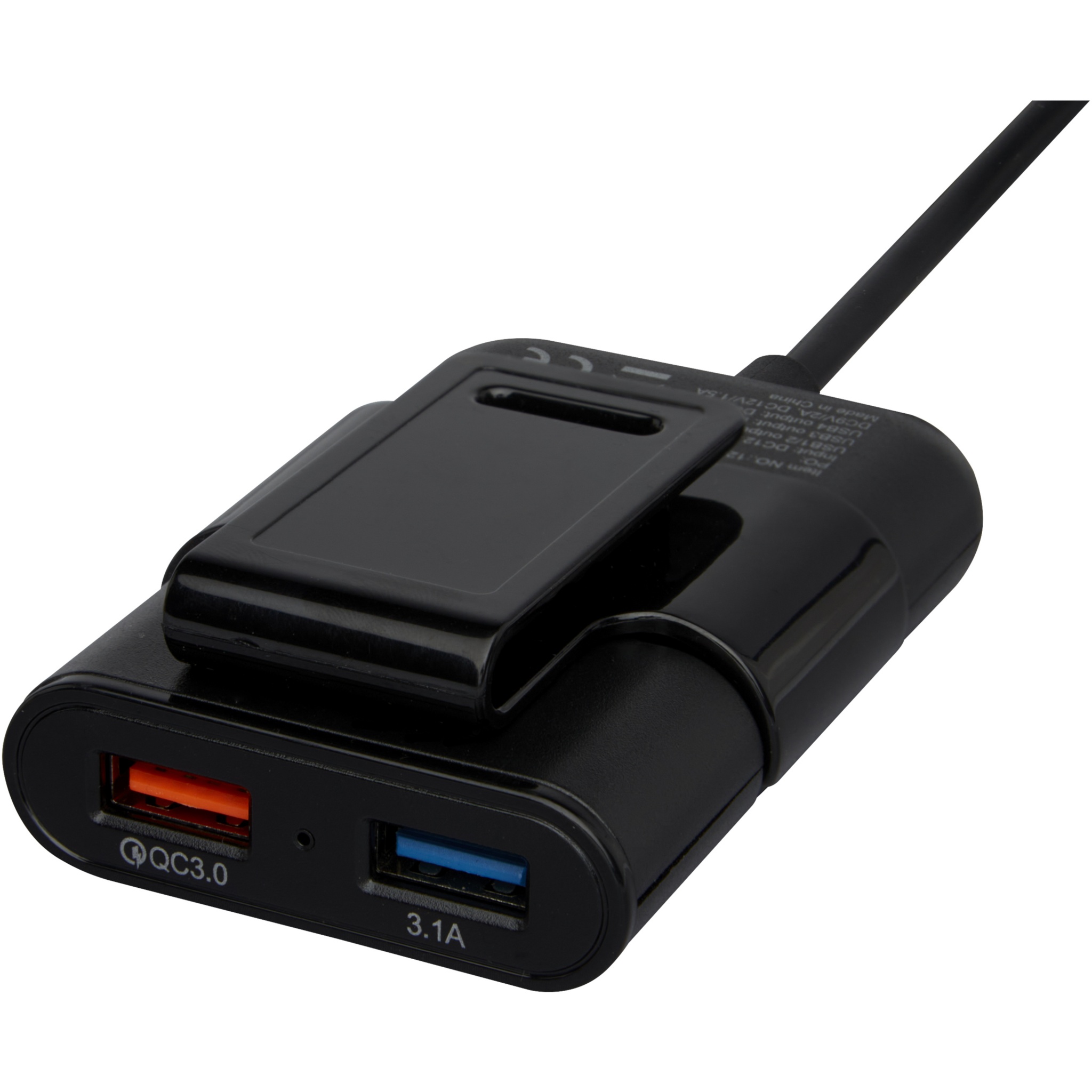 Sukurtas šeimai ir kelionėms, šis įkroviklis leidžia gale ir priekyje sėdintiems keleiviams vienu metu įkrauti savo elektroninius prietaisus kelyje. Universalus suderinamumas su 12/24V transporto priemonėmis. Qualcomm Quick Charge Protocol 3.0. USB1/2 išėjimas: DC5V/2.4A, USB3 išėjimas: DC5V/3.1A, USB4 išėjimas: DC5V/3A, DC9V/2A, DC12V/1.5A. Kabelio ilgis: 170 cm.