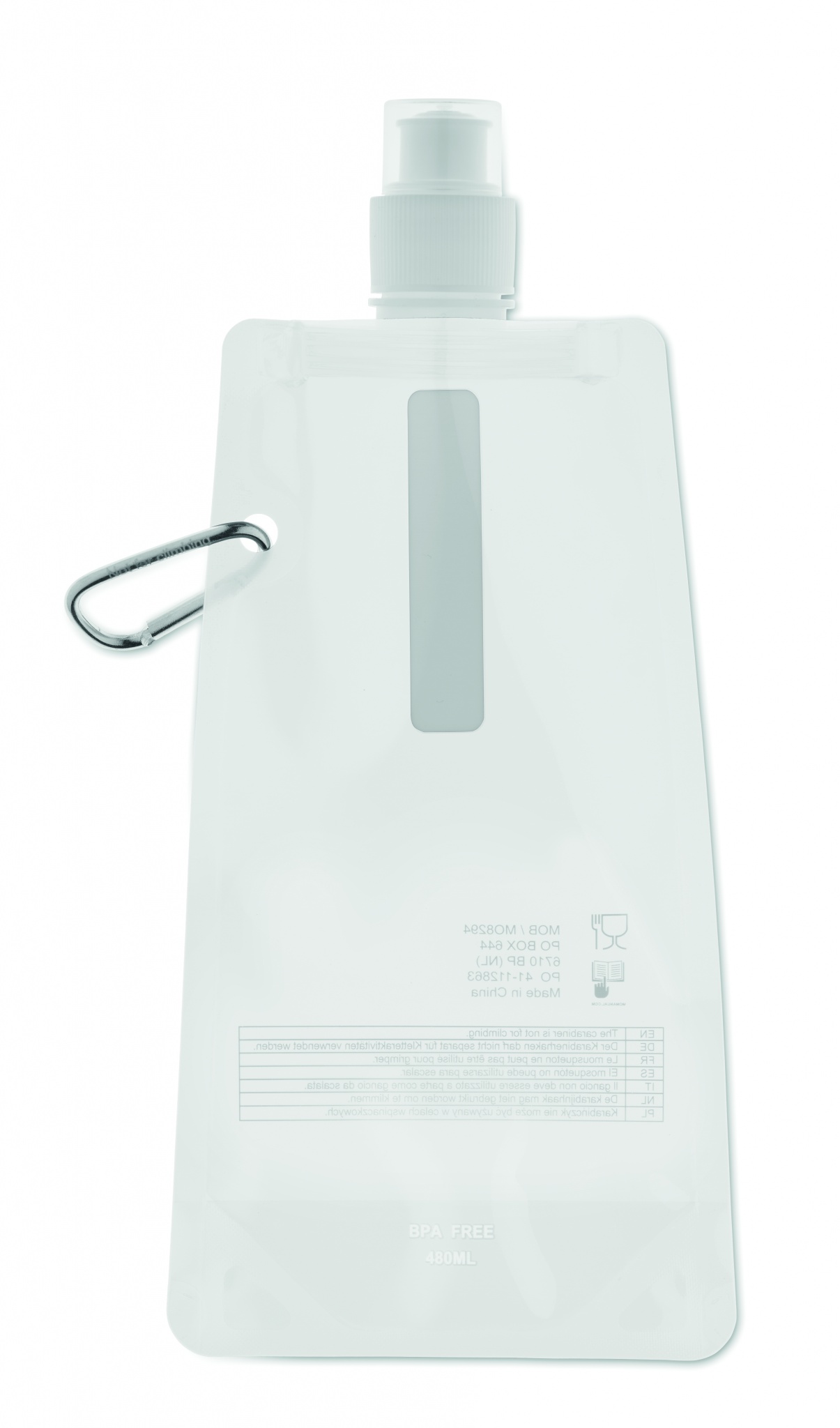Sulankstomas vandens butelis iš PET, kuriame nėra BPA, su aliuminio karabinu. Talpa 480 ml. Nesandarus.