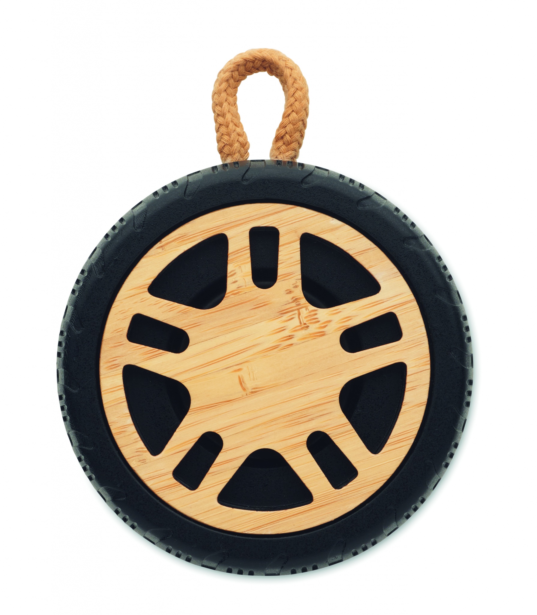 Automašīnas riepas formas 5,3 W bezvadu 3 W skaļrunis no pārstrādāta ABS ar bambusa detaļām un kokvilnas virves rokturi. 400 mAh uzlādējams akumulators.
