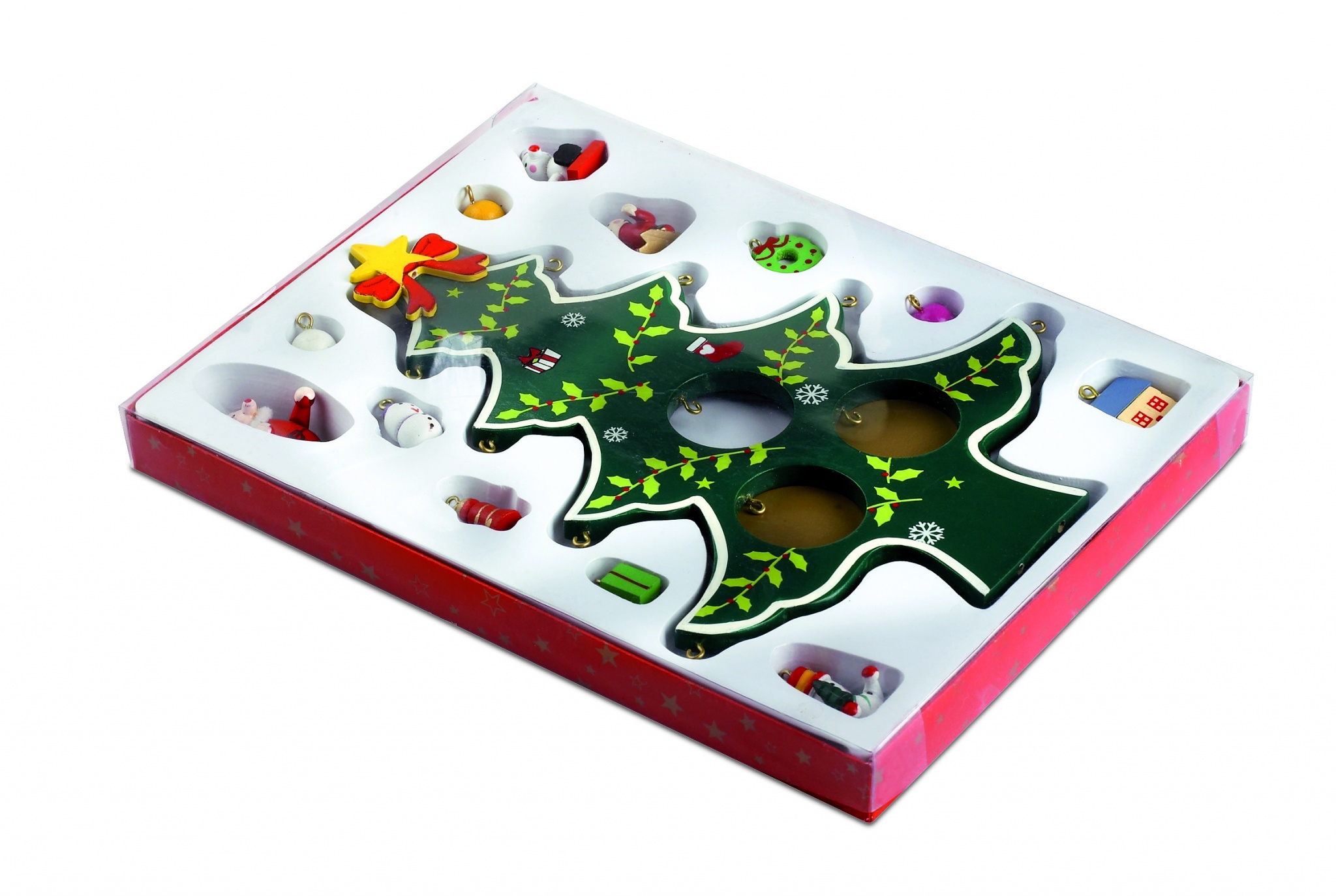 Koka eglīte ar 12 dažādu koku pakaramo rotājumu komplektēšanu. Individuāla dāvanu kastīte ar caurspīdīgu vāciņu.