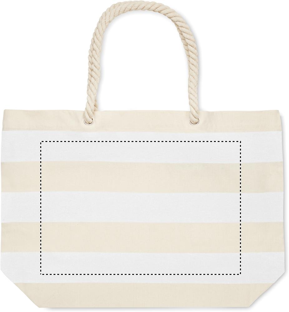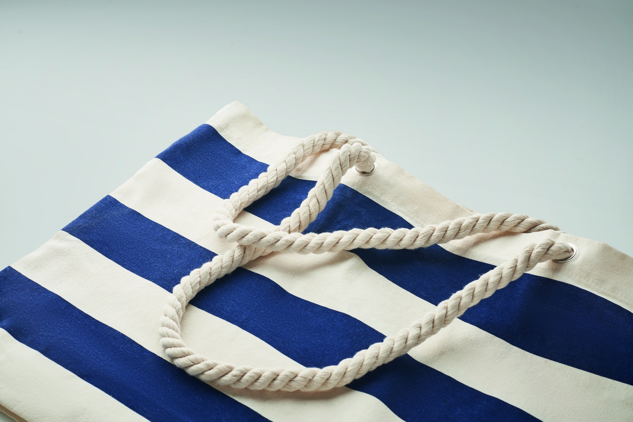 Svītraina pludmale vai iepirkumu maisiņš no kokvilnas ar auklas rokturi. 220 gr/m².