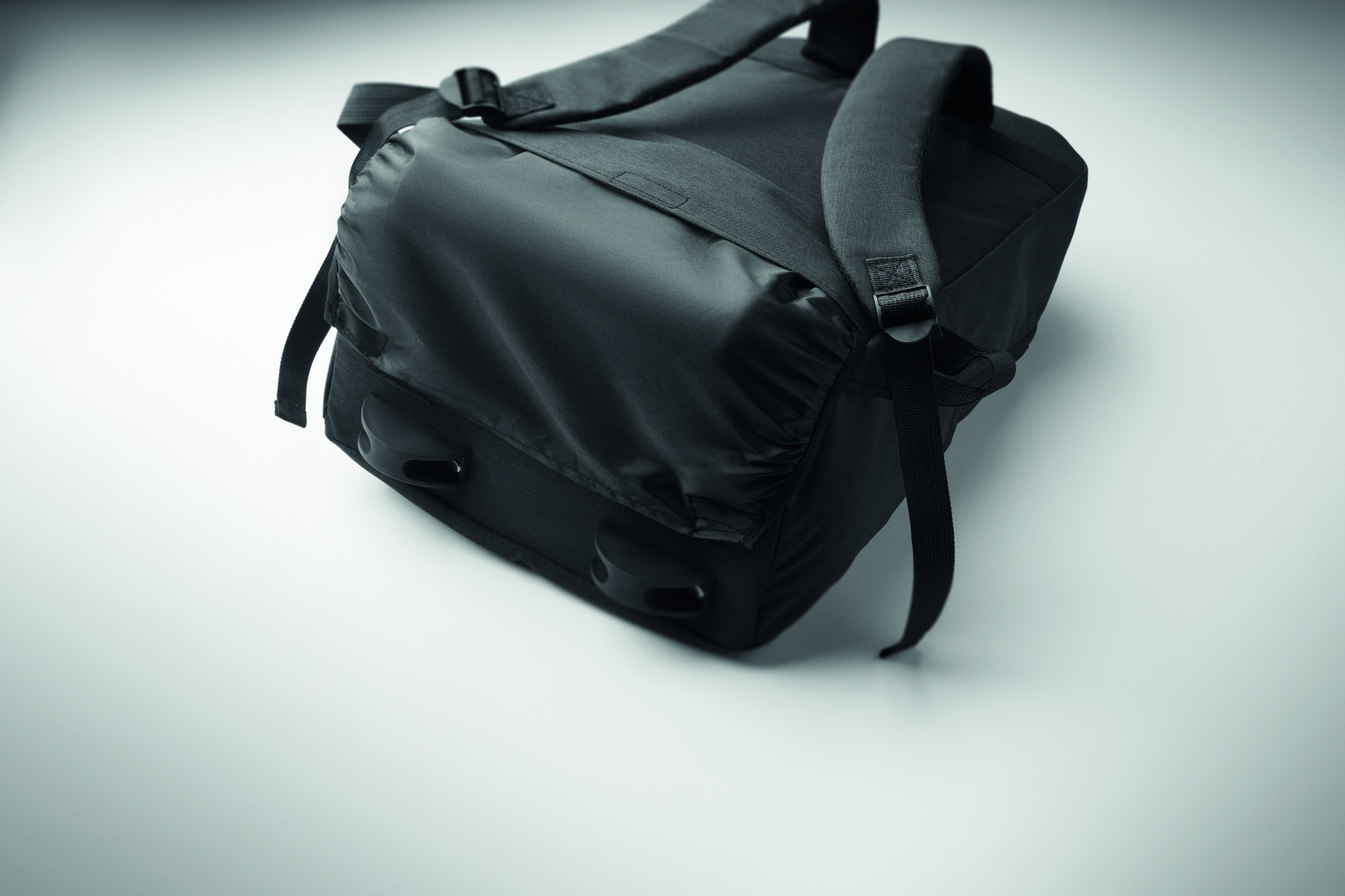 Logotrade biznesa dāvanas foto: Pārnēsājams mugursomas ratiņš ar riteņiem, izgatavots no 600D RPET poliestera.