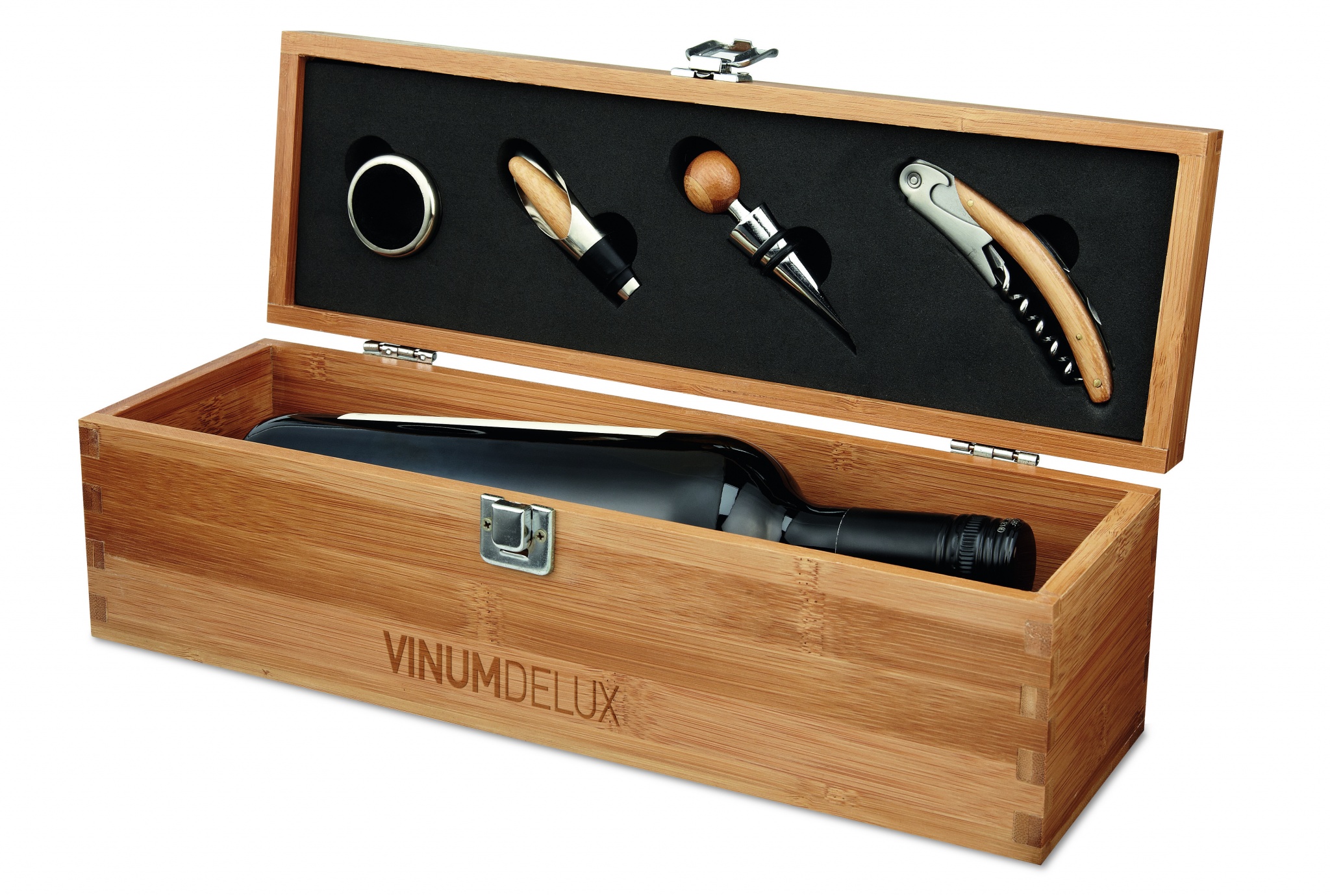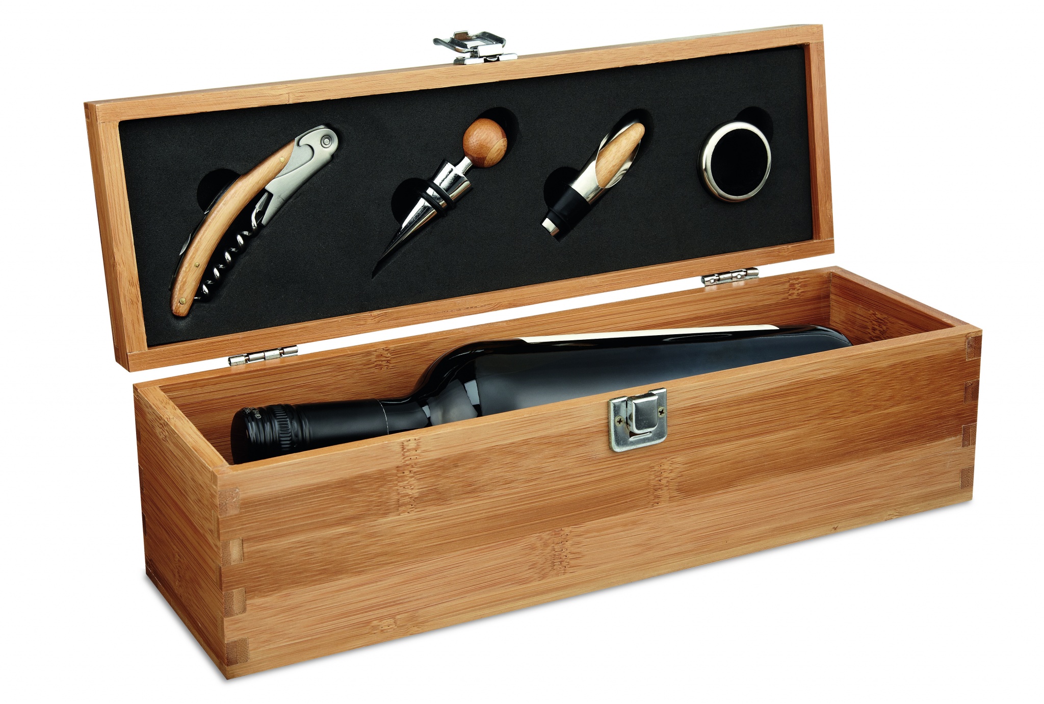 Vīna komplekts bambusa dāvanu kastītē ar vietu vienai vīna pudelei. Ietver pudeļu apkakli, pildītāju, aizbāzni un korķviļķi. Vīna pudele nav iekļauta. Bambuss ir dabisks produkts, katrai precei var būt nelielas krāsas un izmēra atšķirības, kas var ietekmēt gala apdares rezultātu.