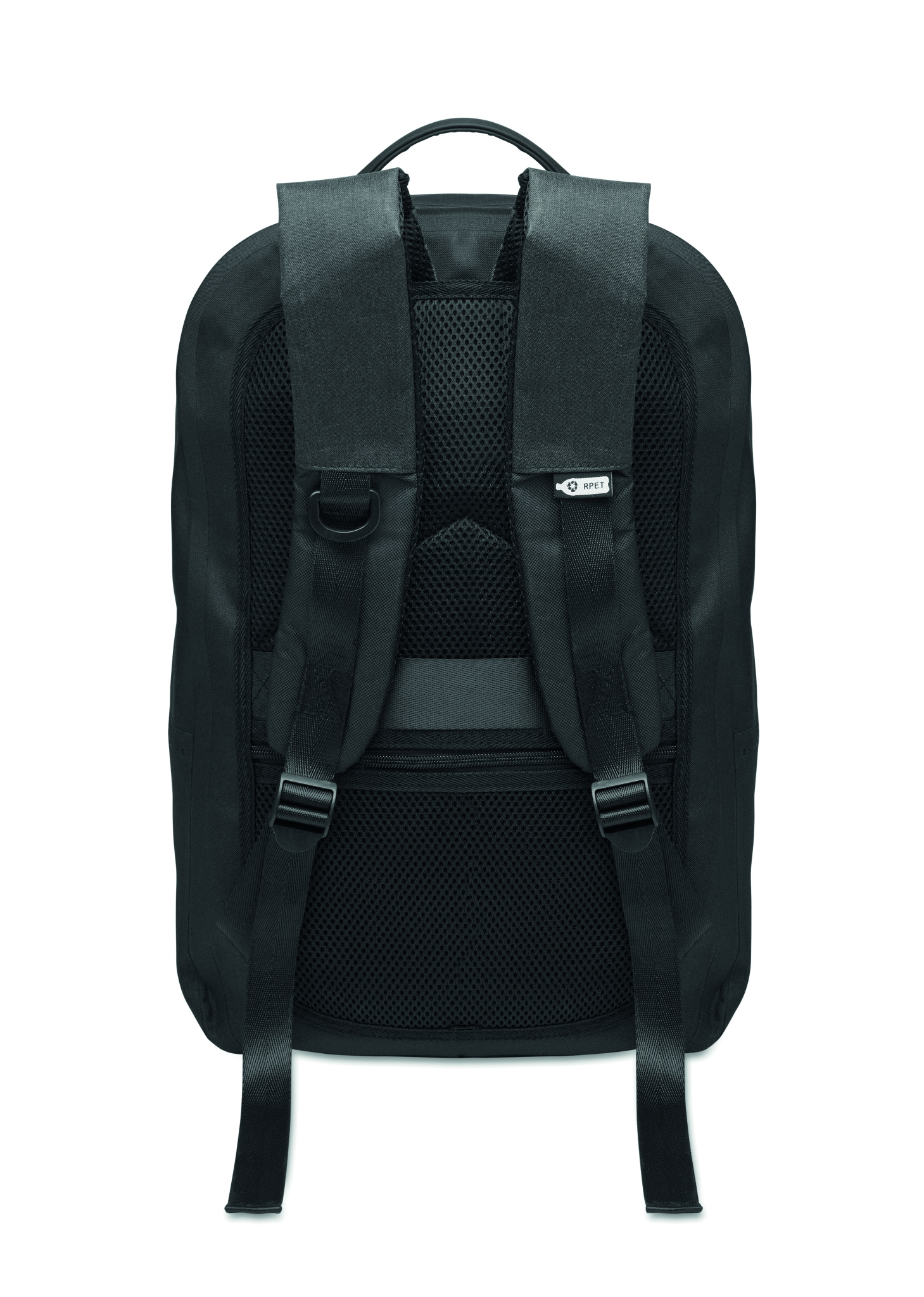 Laptop backpack 16'' in 300D RPET polyester and 210D polyester lining. Water-resistant fabric. Hidden zippered pocket and trolley holder on the back. Padded internal laptop compartment, mesh back and shoulder strap.