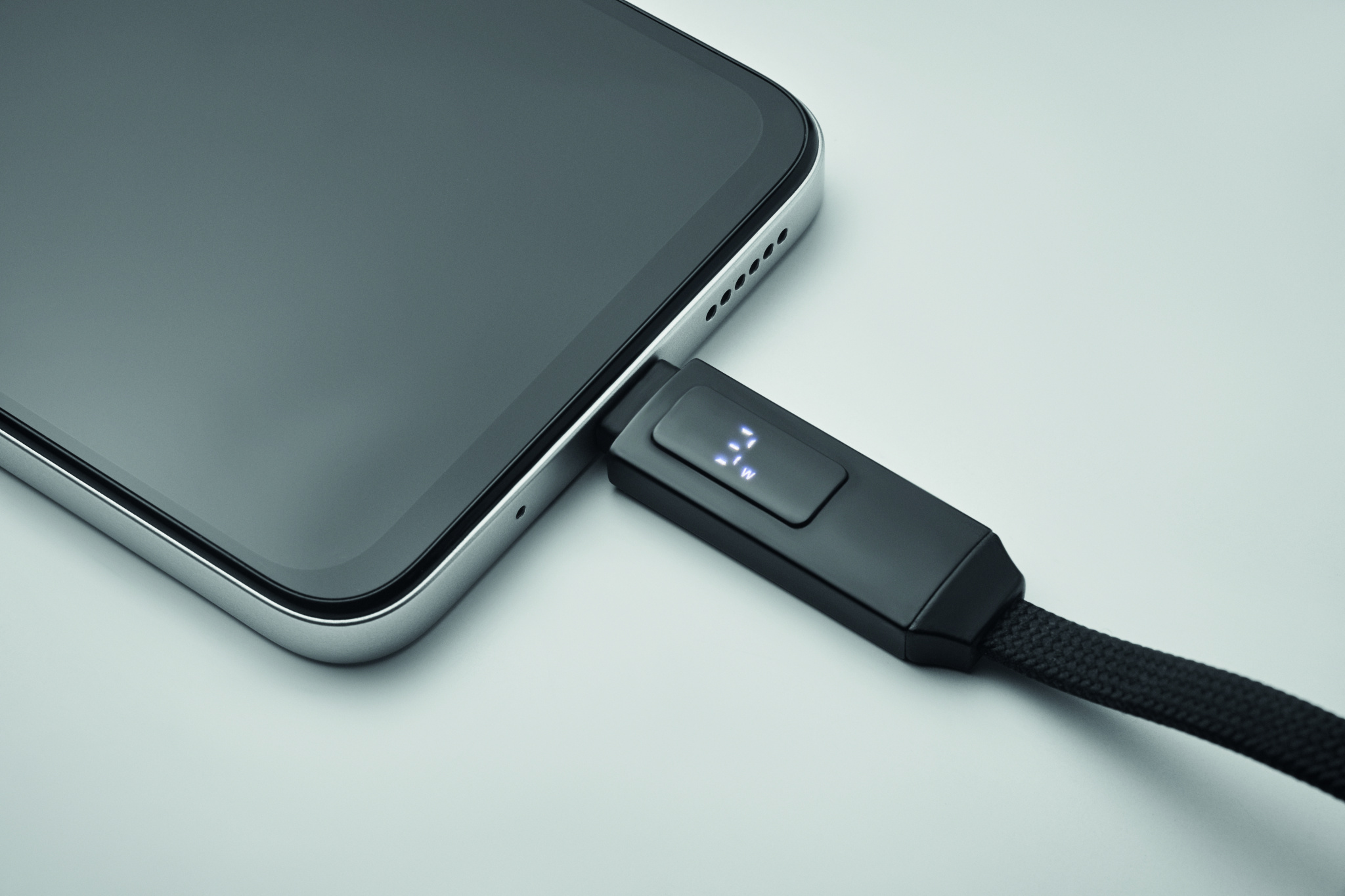 60W charging and data cable with keyring. Type-C to type-C with LED screen with charging power display feature. Magnet closure.