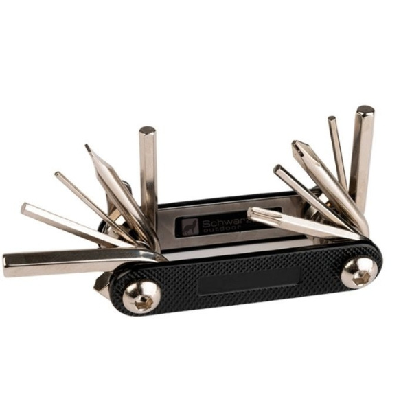 Практичный набор инструментов для байкеров. Включает в себя многофункциональный инструмент для ремонта велосипеда и петлю. Упакован в коробку Schwarzwolf.