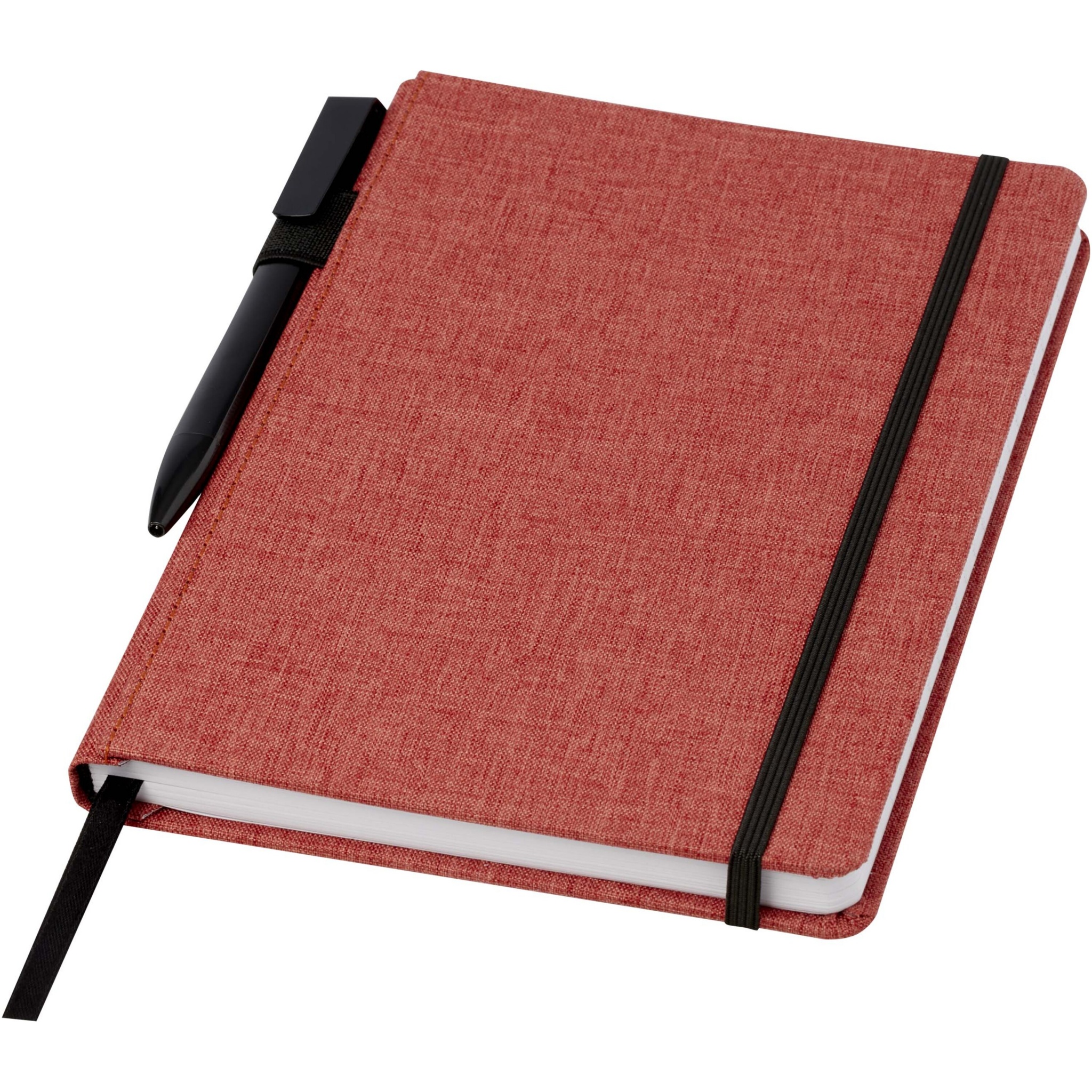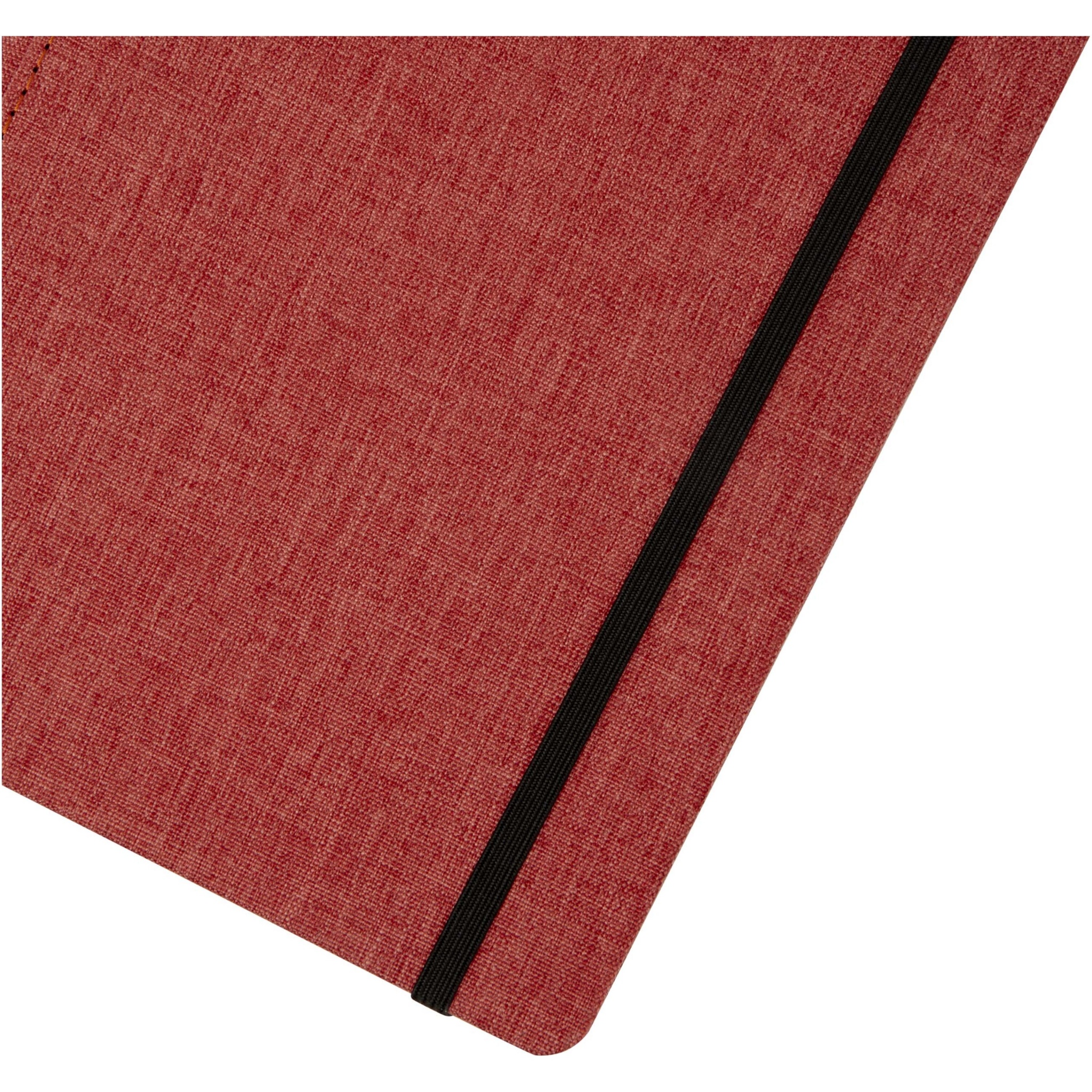 Блокнот формата А5 с отделкой из переработанного ПЭТ. Содержит 96 листов в линию плотностью 70 г/м², изготовленных из переработанной бумаги, с петлей для ручки и лентой-закладкой. В упаковке из картона.