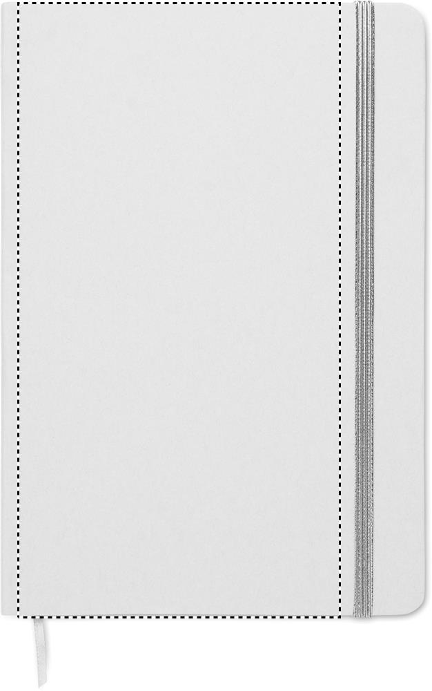 A5 notebook with hard recycled carton cover. White cover. Casebound. 160 lined recycled paper pages (80 sheets). Elastic closure strap, ribbon bookmark matching with revealed colour. After laser engraving the colour is revealed.