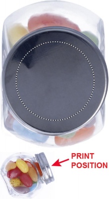 Разноцветные леденцы в стеклянной банке с металлической крышкой.