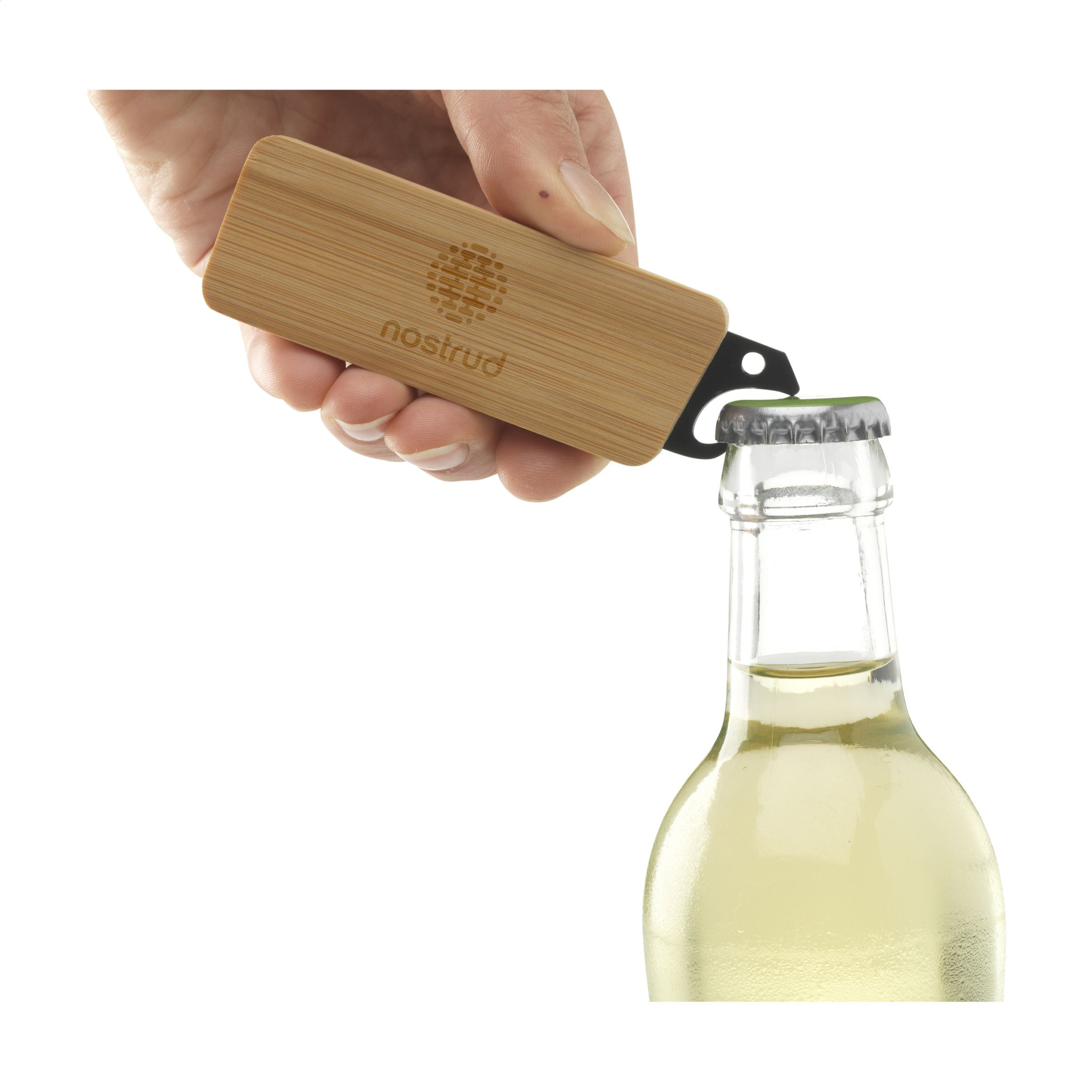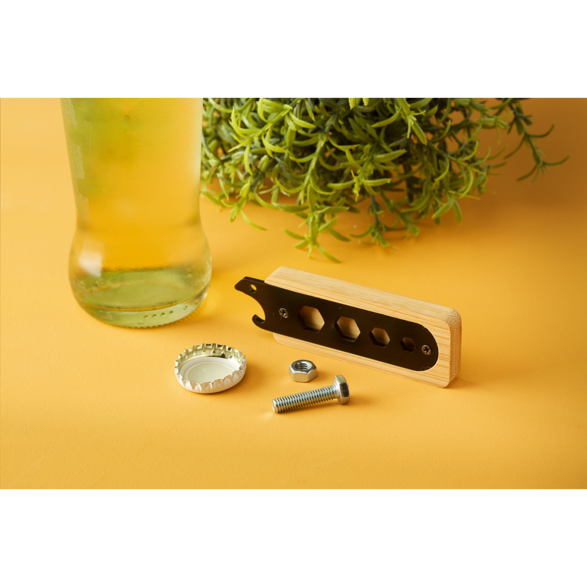 Удобный многофункциональный инструмент с открывалкой для бутылок из нержавеющей стали с бамбуковой ручкой и 4 плоскими ключами разных размеров.