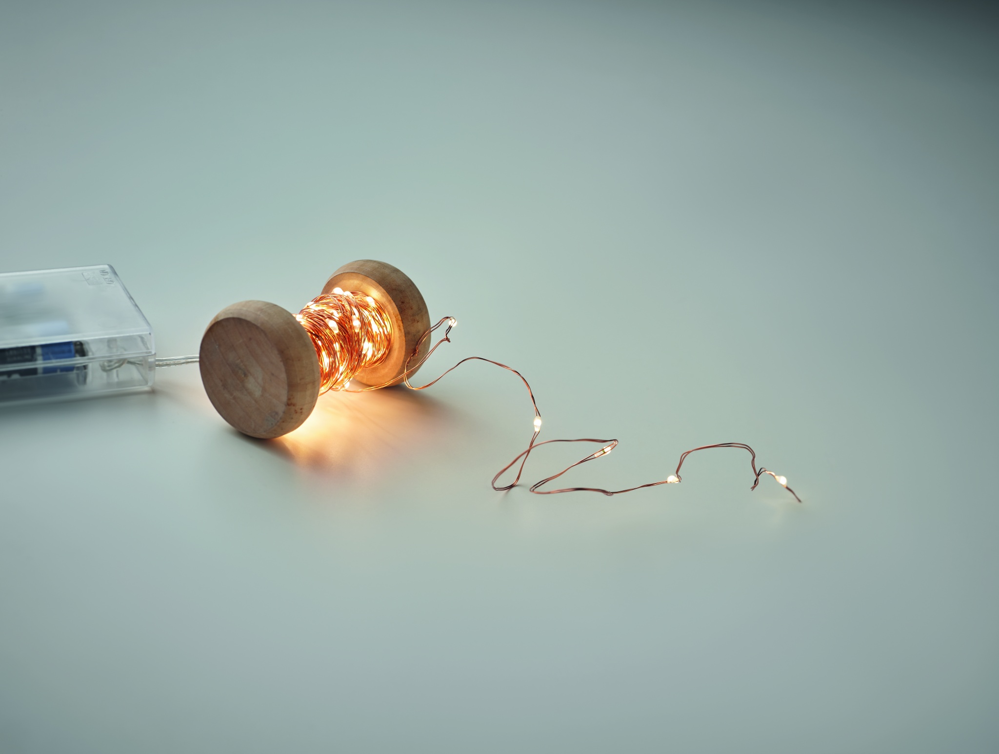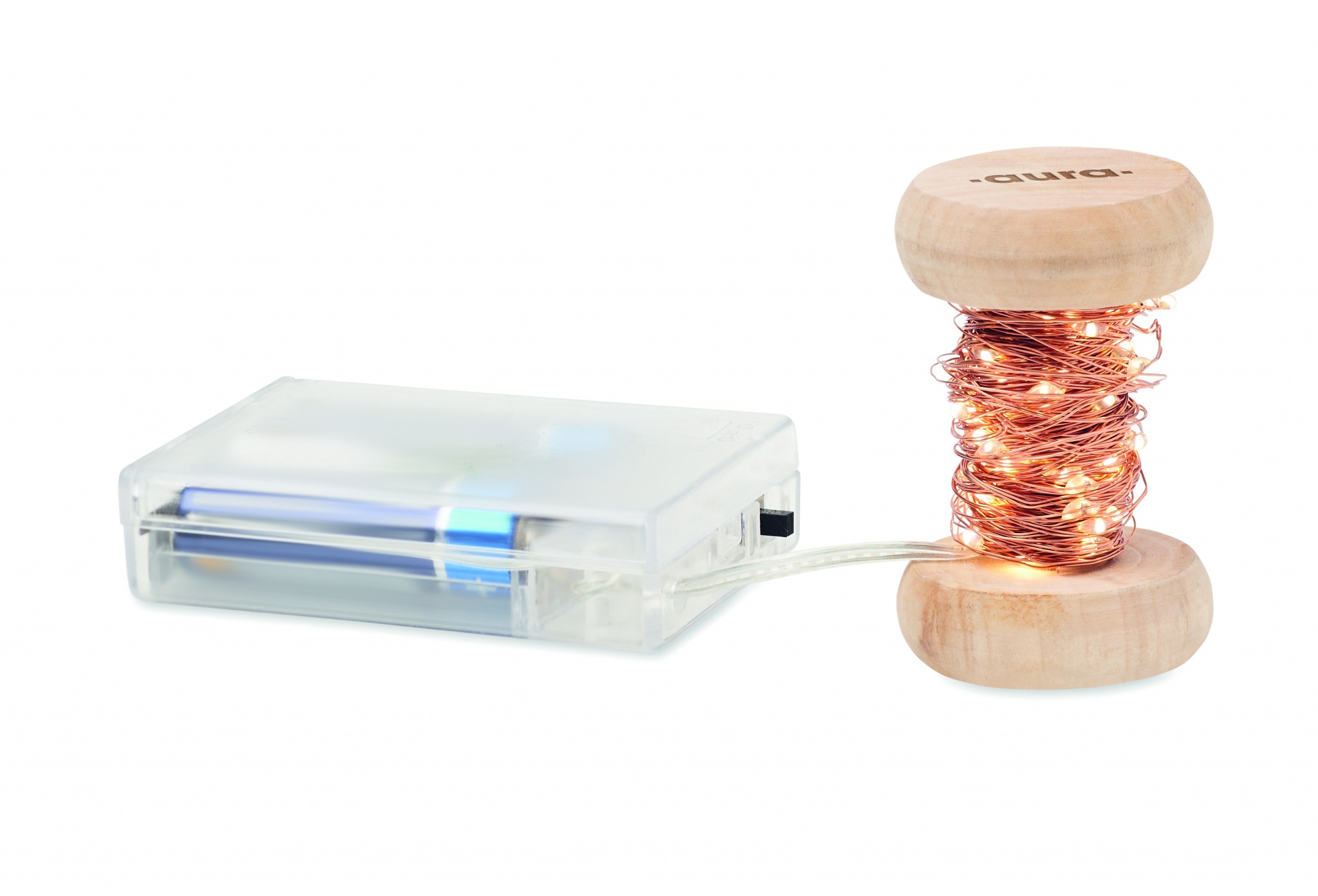 Гирлянда из 50 светодиодных лампочек теплого желтого оттенка на деревянной катушке. Длина: 5 м. 3 батарейки типа АА в комплект не входят.