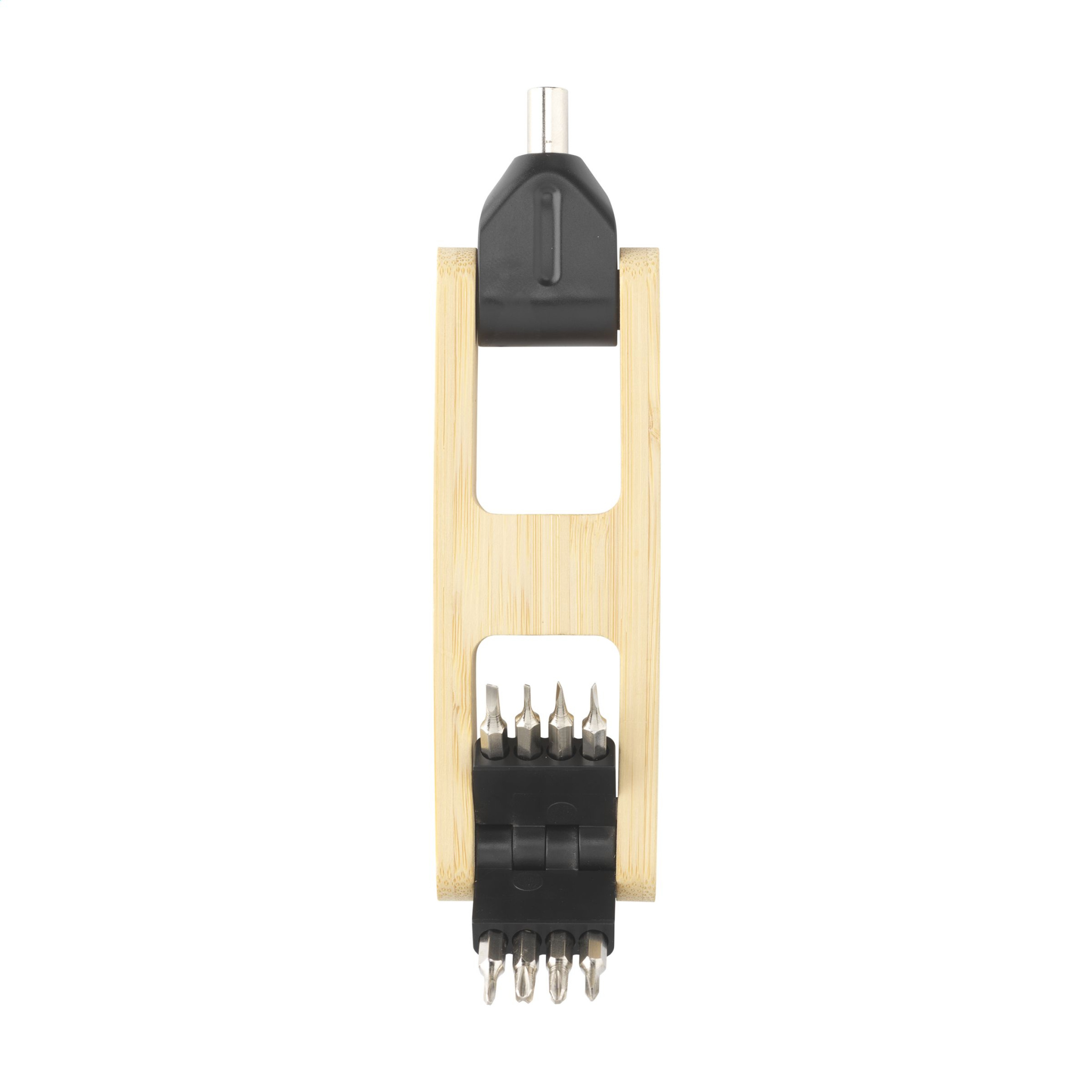 Набор из 9 отверточных бит с прочной бамбуковой рамой. Включает магнитный держатель бит и 8 стальных инструментов: 4 крестообразные отвертки и 4 шлицевые отвертки. Компактный и практичный набор, который можно легко носить с собой. Каждый предмет поставляется в индивидуальной коричневой картонной коробке.