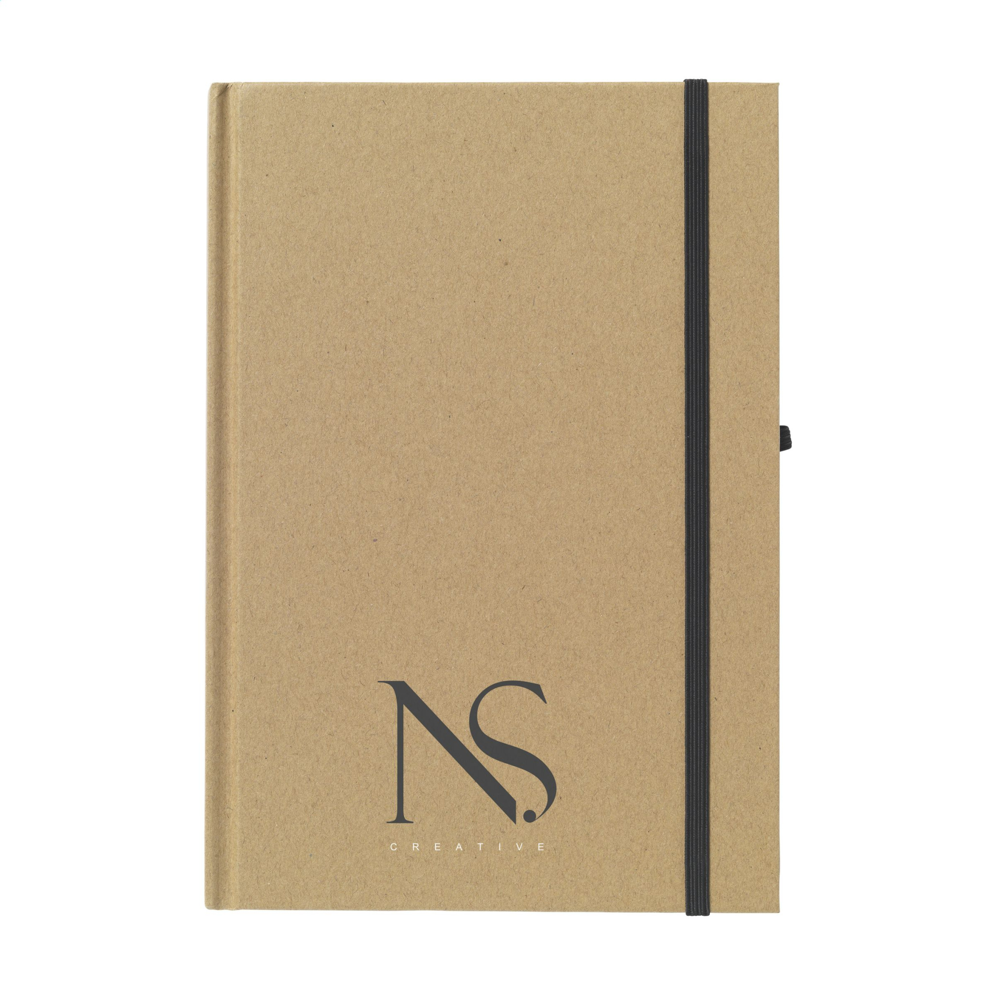 Блокнот формата А5 из переработанного материала. Примерно 80 листов/160 страниц кремовой линованной бумаги (70 г/м²), удобная петля для ручки и эластичная застежка.