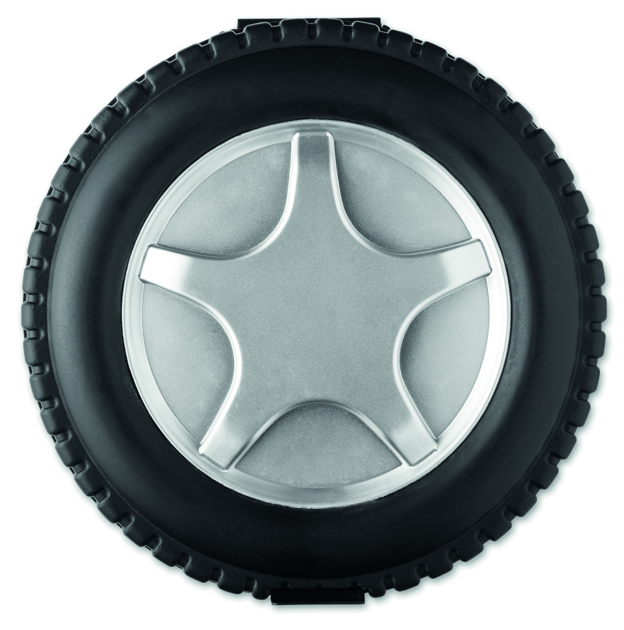 Набор 25 инструментов в виде автомобильной шины: отвертки, ключи, рулетка, пассатижи.