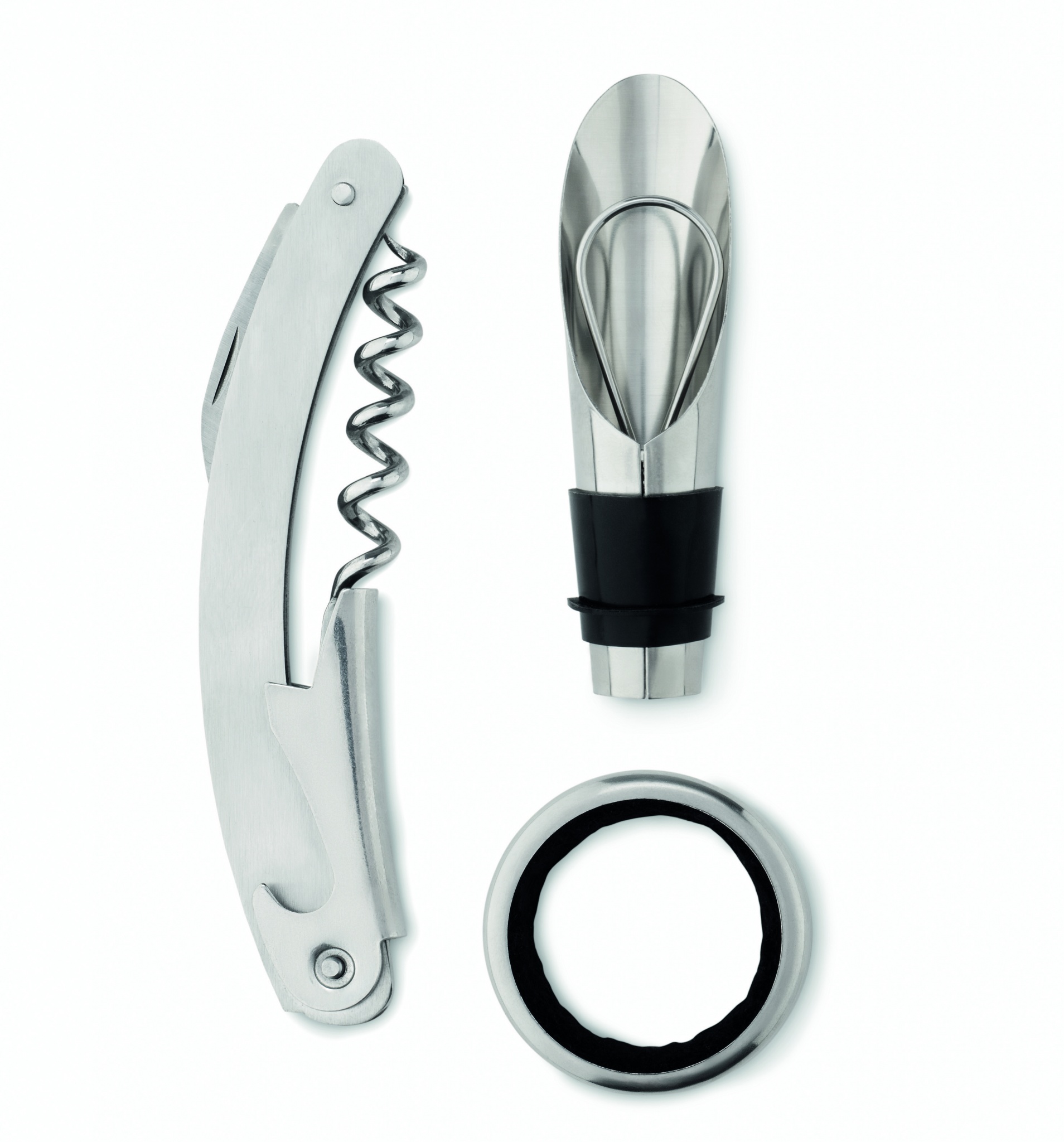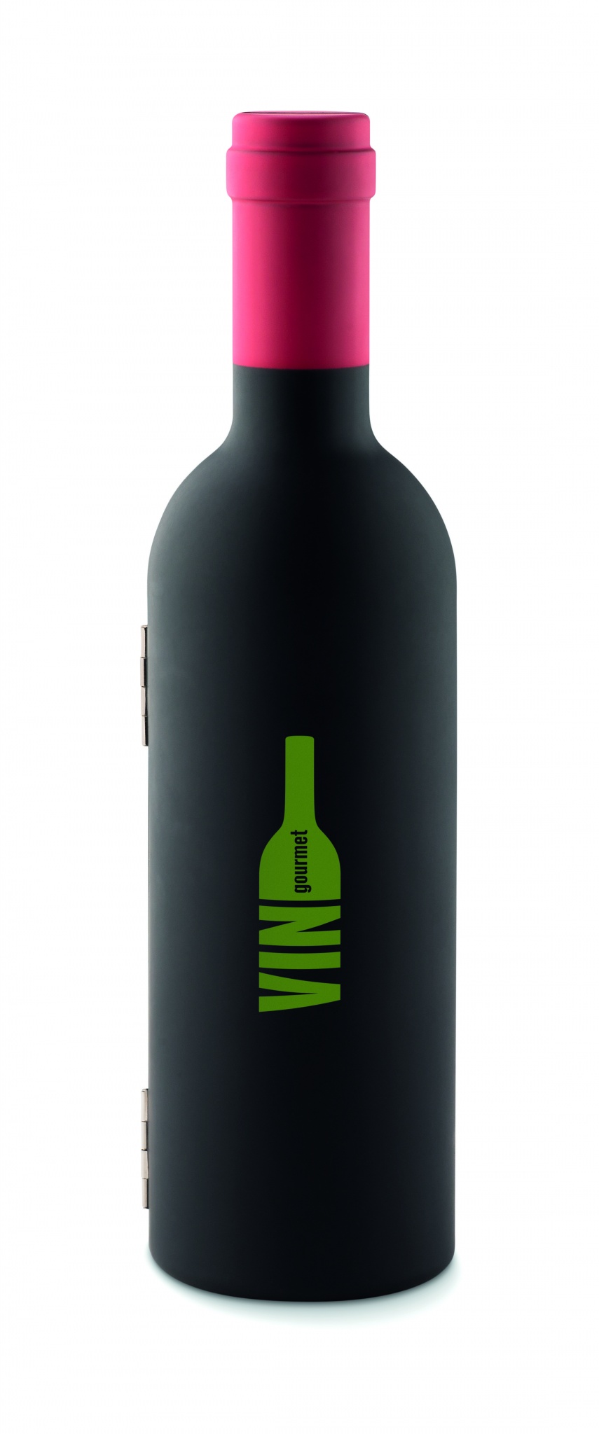 Винный набор в форме бутылки, включающий пробку, штопор и воротник для бутылки. Закрывается на магнит.