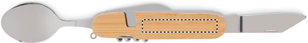 Перочинный нож со столовыми приборами в деревянном корпусе. Включает вилку, ложку, консервный нож, штопор и нож. Можно разделить набор на 2 части.