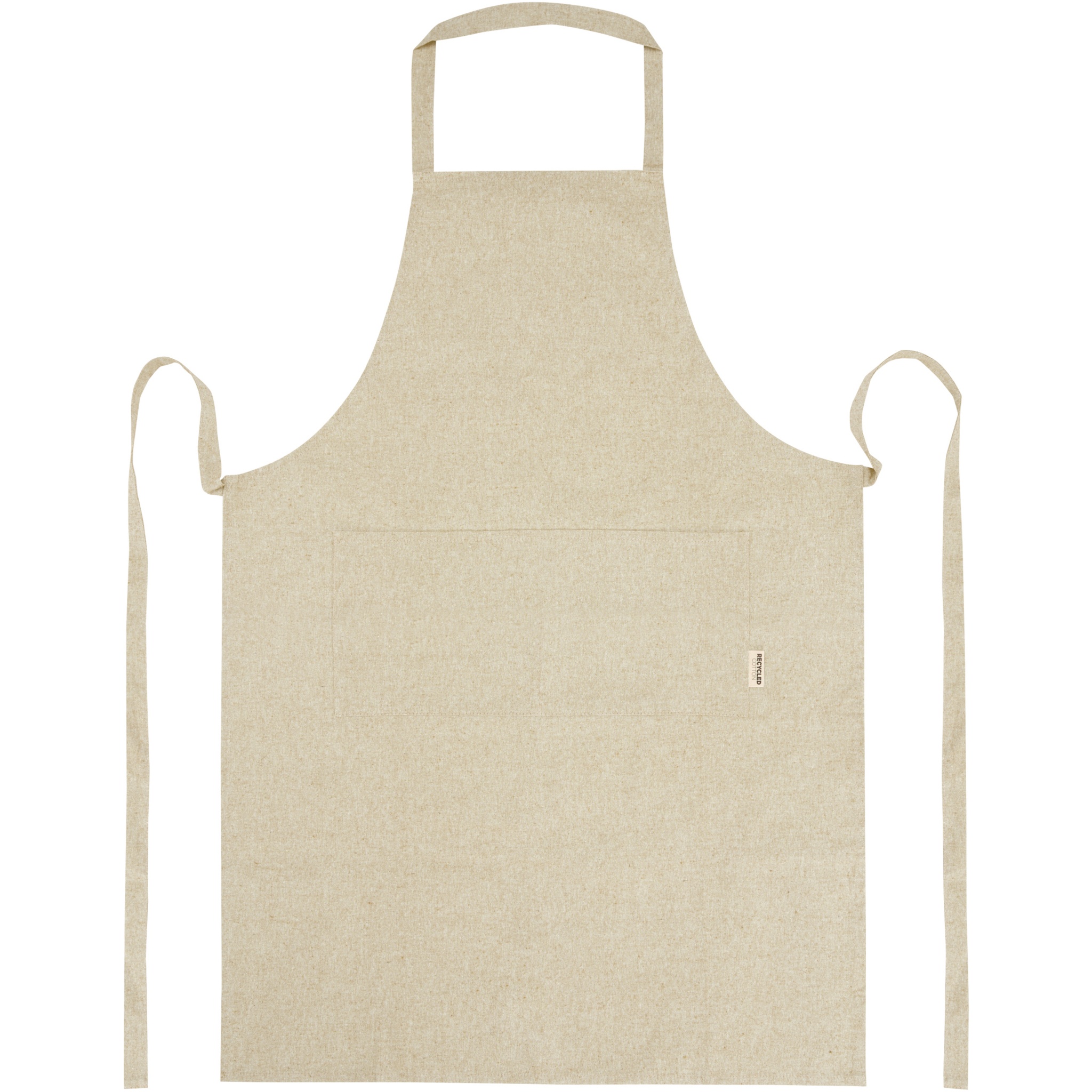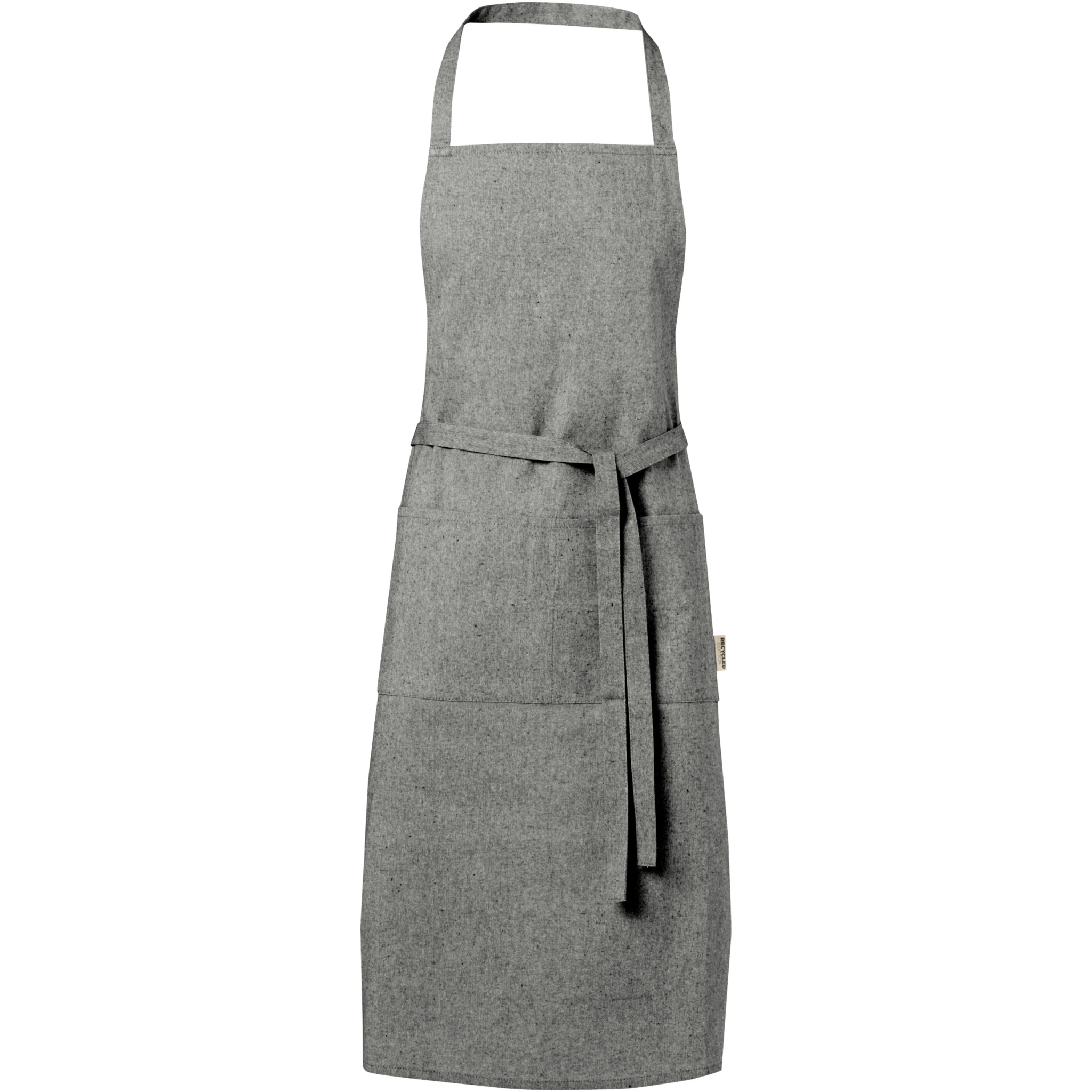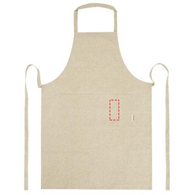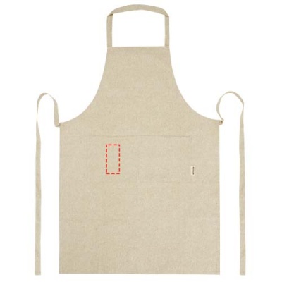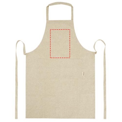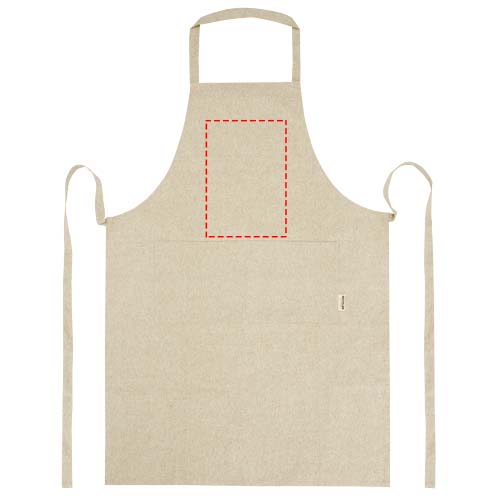 Фартук из смеси переработанного хлопка и полиэстера плотностью 200 г/м². Имеет два смежных кармана общим размером 45 x 20 см и завязку на спине длиной 1 метр. Вторичный хлопок изготавливается из отходов, предназначенных для потребления, которые производятся текстильными фабриками в процессе резки. Из-за особенностей переработанного хлопка возможно незначительное несоответствие цвета. Благодаря этому сумка выглядит более аутентичной. Длина шейного ремешка: 55 см