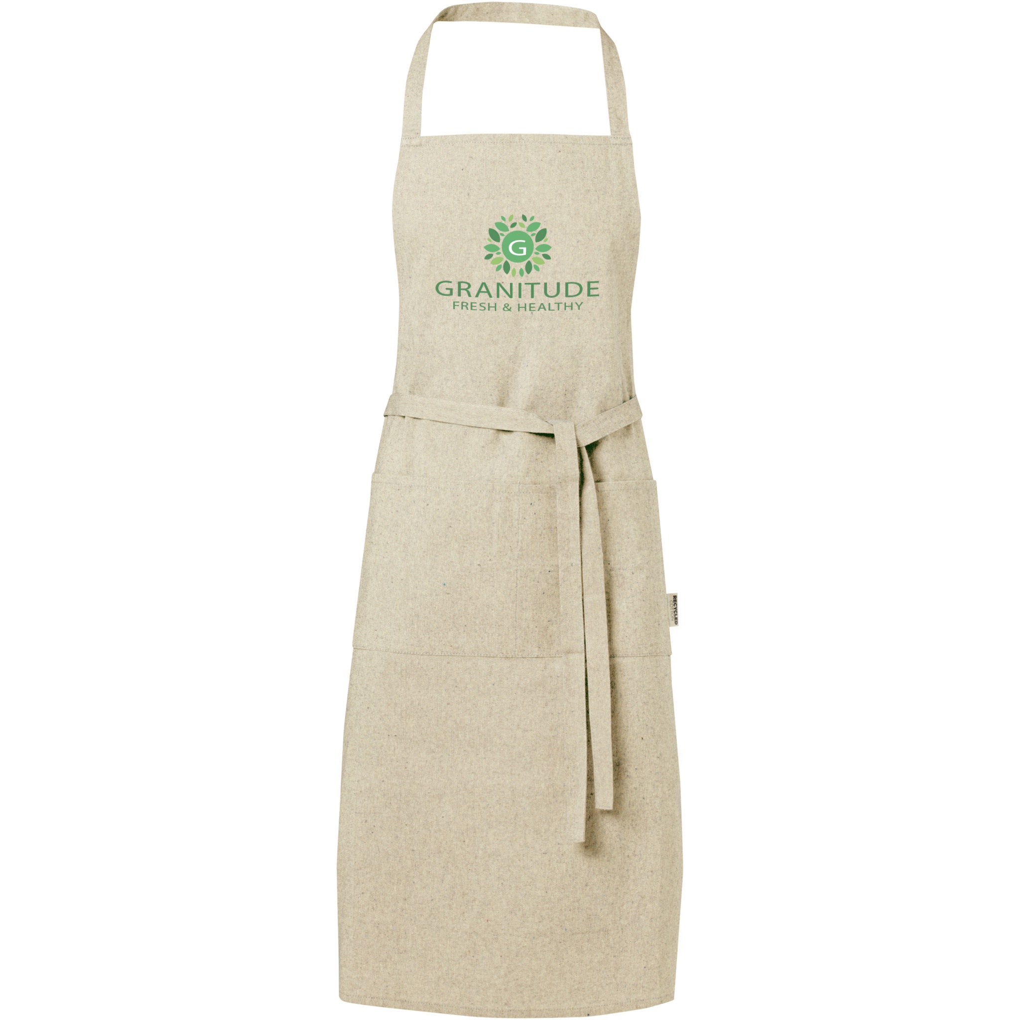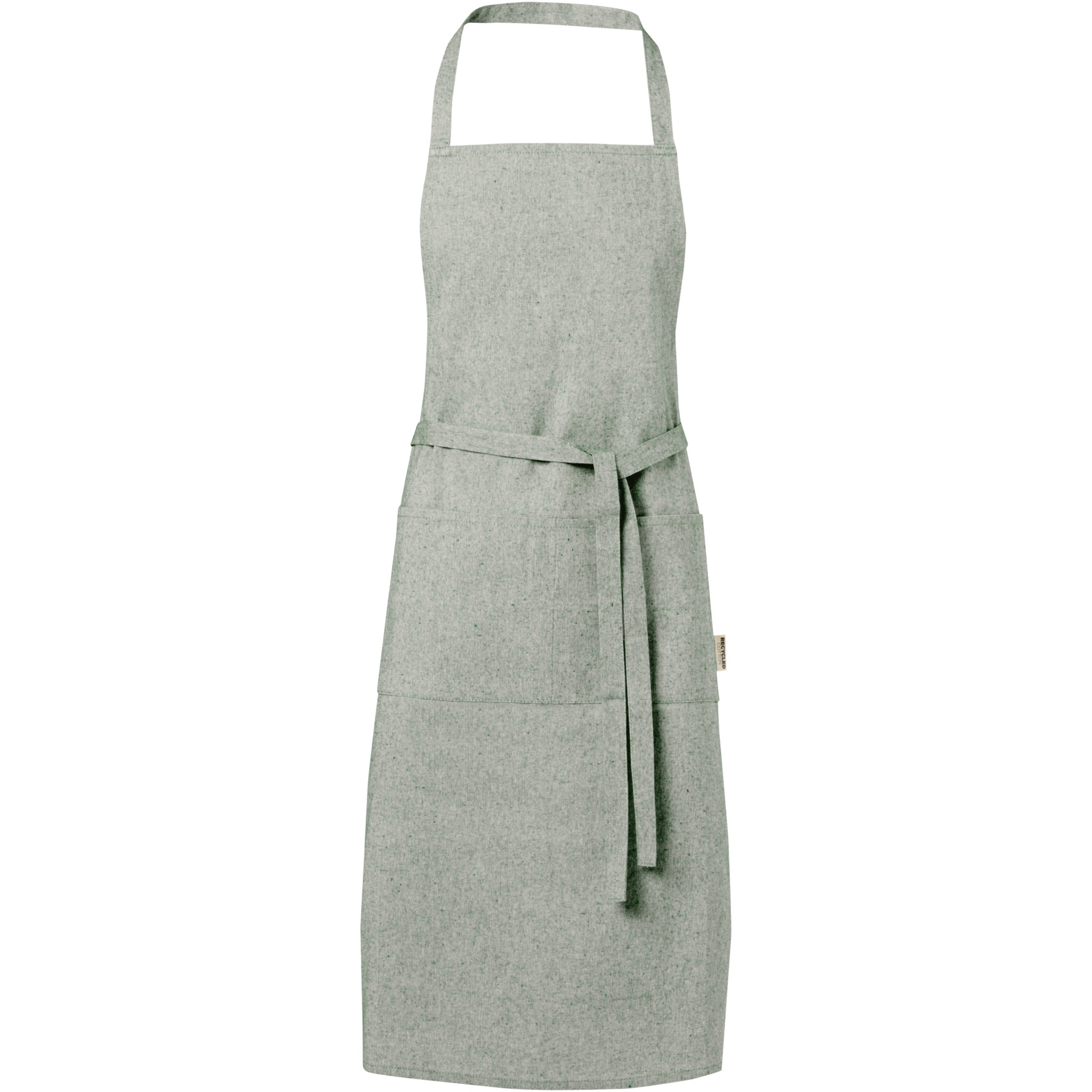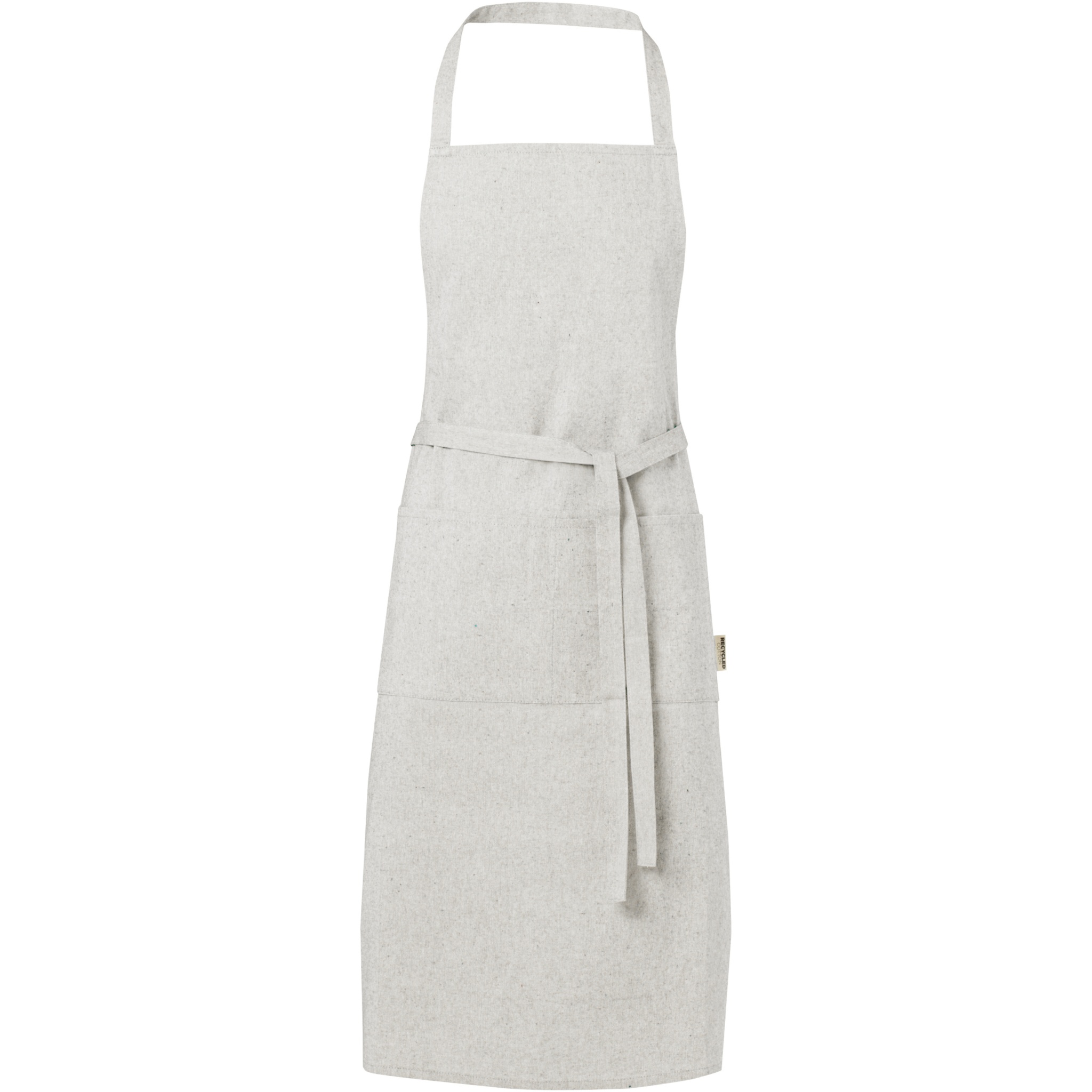 Фартук из смеси переработанного хлопка и полиэстера плотностью 200 г/м². Имеет два смежных кармана общим размером 45 x 20 см и завязку на спине длиной 1 метр. Вторичный хлопок изготавливается из отходов, предназначенных для потребления, которые производятся текстильными фабриками в процессе резки. Из-за особенностей переработанного хлопка возможно незначительное несоответствие цвета. Благодаря этому сумка выглядит более аутентичной. Длина шейного ремешка: 55 см