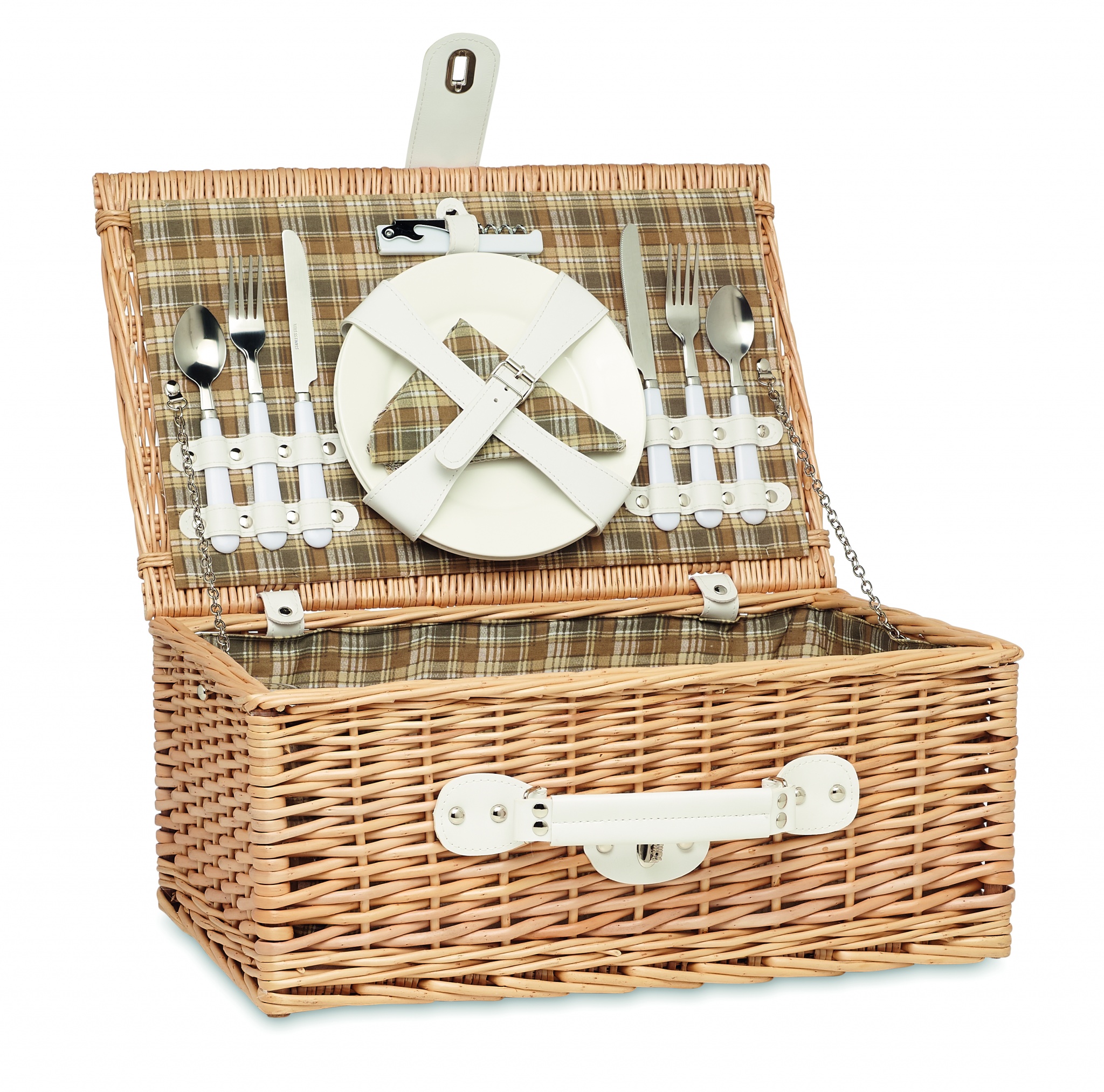 Плетеная корзина для пикника на 2 персоны. В комплекте штопор, 2 ложки из нержавеющей стали, вилки и ножи, 2 керамические тарелки, 2 стакана и 2 салфетки из поликоттона.