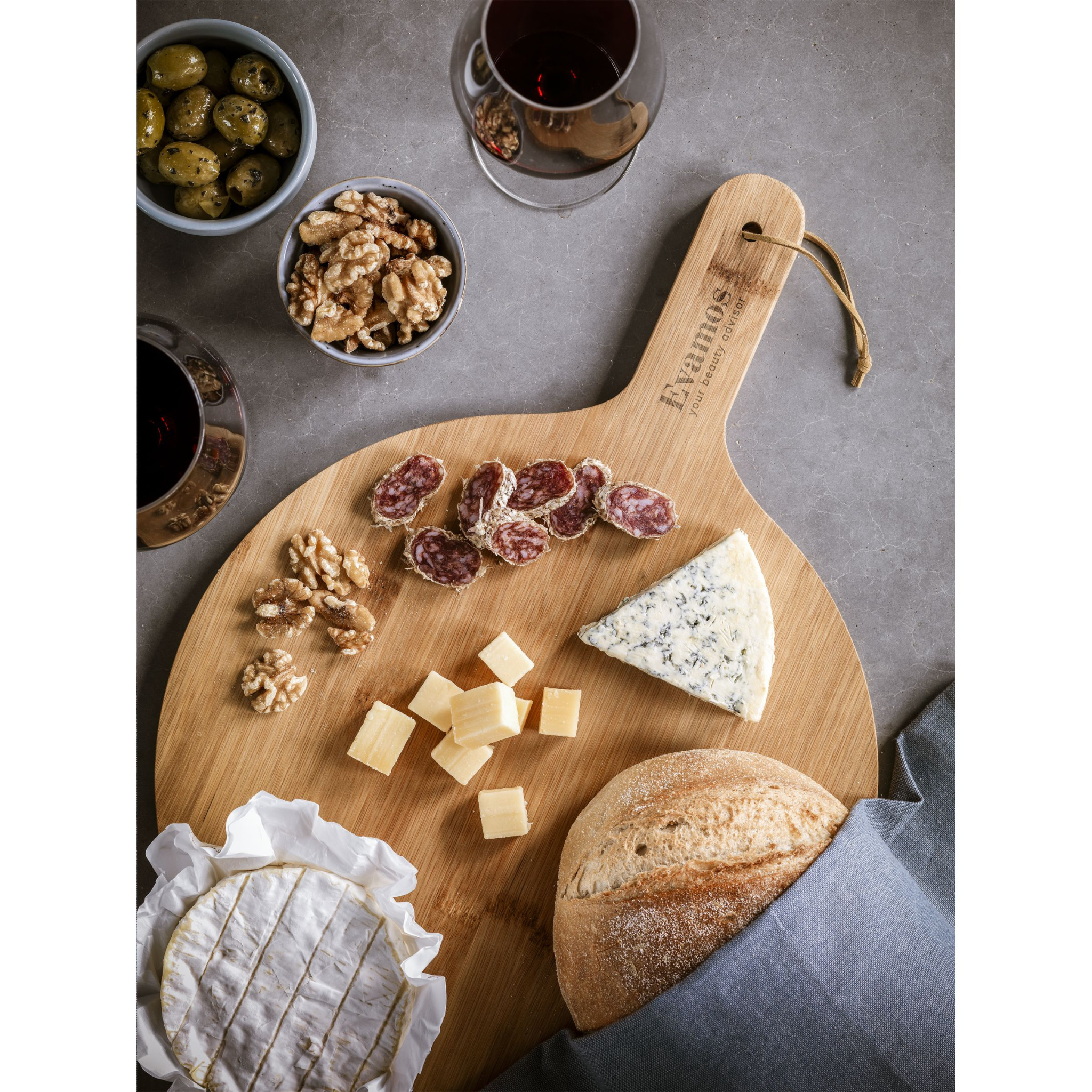 Круглая сервировочная доска с кожаным шнуром. Изготовлена из прочного, полированного, 100% сертифицированного FSC бамбука. Гигиеничная, антибактериальная и легко моется. Эта доска имеет большую сервировочную поверхность диаметром не менее 31,5 см. Щедрый размер для подачи пиццы или тапас во время вечеринок и с напитками. Также подходит как сырная доска и разделочная доска. ПРИМЕЧАНИЕ: Из-за естественных волокон и контуров бамбука мы не можем гарантировать постоянство глубины/цвета гравировки. Каждый предмет поставляется в индивидуальной коричневой картонной коробке.