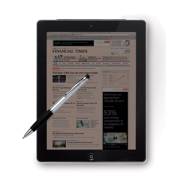 Ручка стилус шариковая пластиковая с поворотным механизмом и мягком обхватом. Синие чернила.