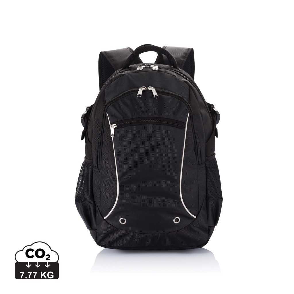 1680D и жаккардовый рюкзак. Передний карман на молнии с органайзером. Основное отделение на молнии с мягким карманом для ноутбука 15,6". Светоотражающая окантовка. Два боковых сетчатых кармана. Не содержит ПВХ.