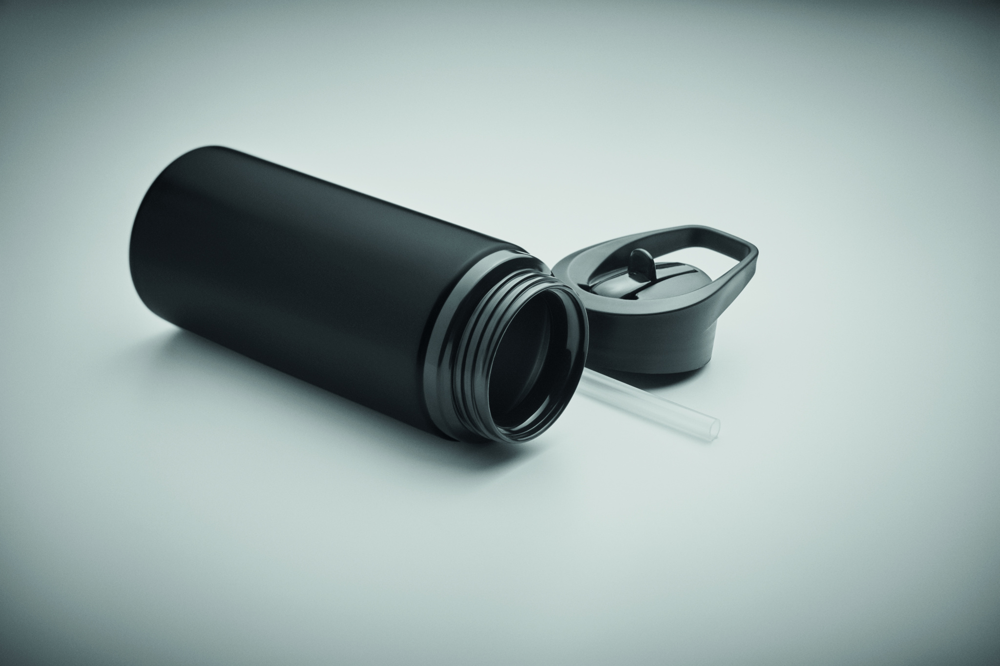 Recycled stainless steel (90% recycled stainless steel and 10% stainless steel) single wall bottle with foldable mouth piece, straw and lid with carrying handle. Capacity: 500 ml.