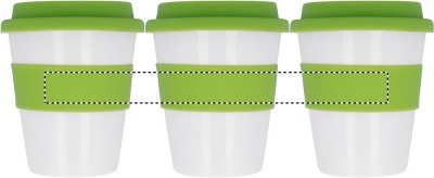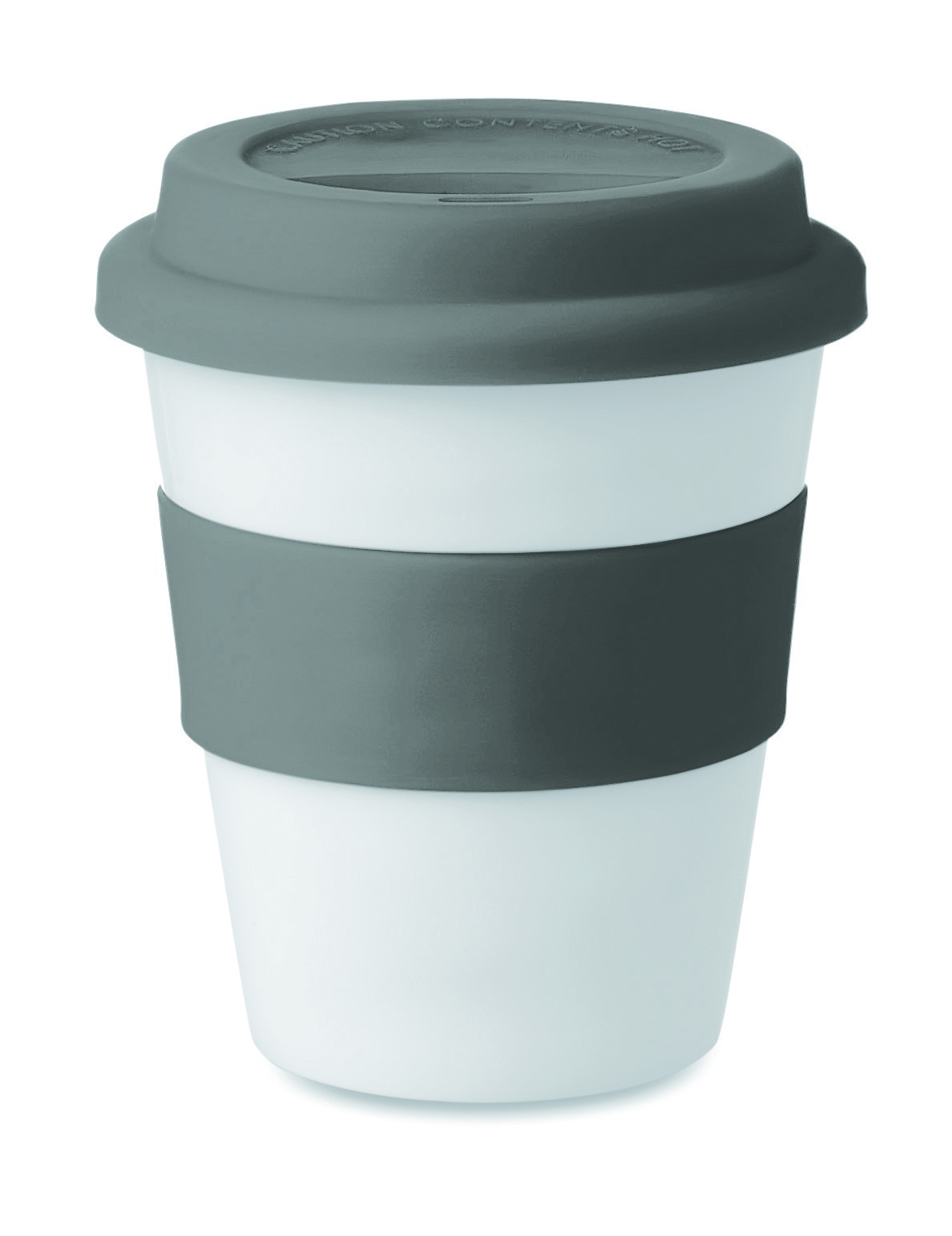 Одностенчатый стакан из блестящего белого полипропилена с силиконовой крышкой и ободком. Емкость 350мл. Поскольку это одностенчатое изделие, осторожно - может нагреваться!